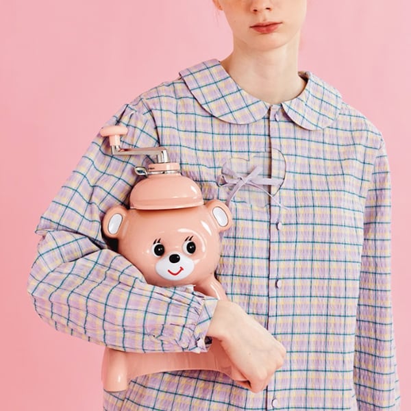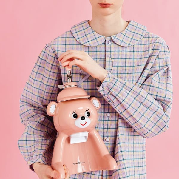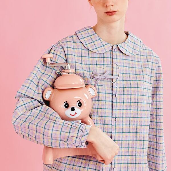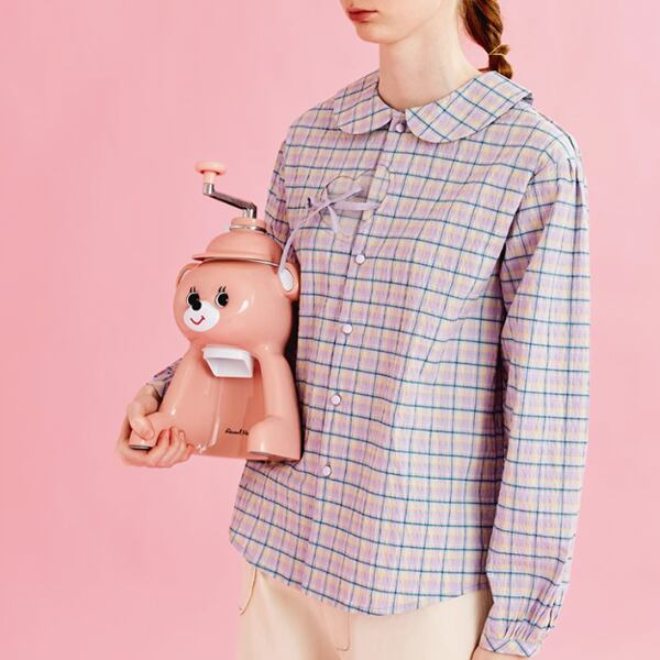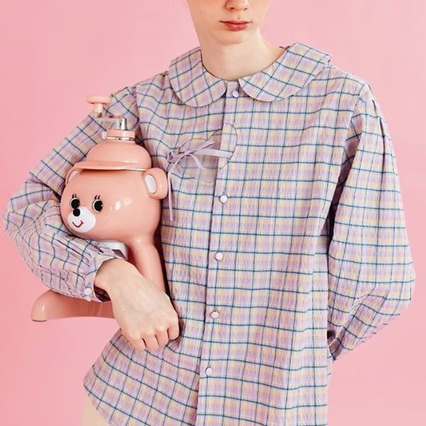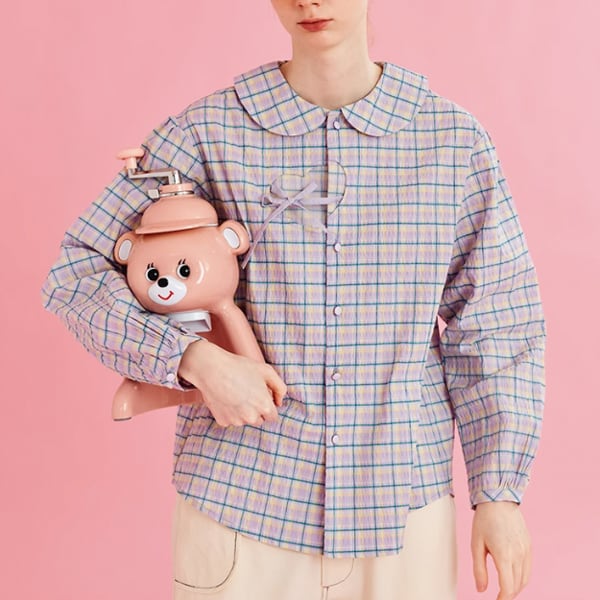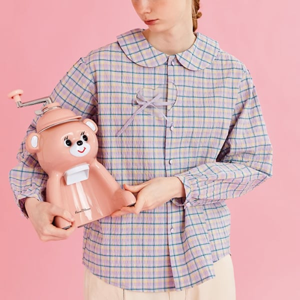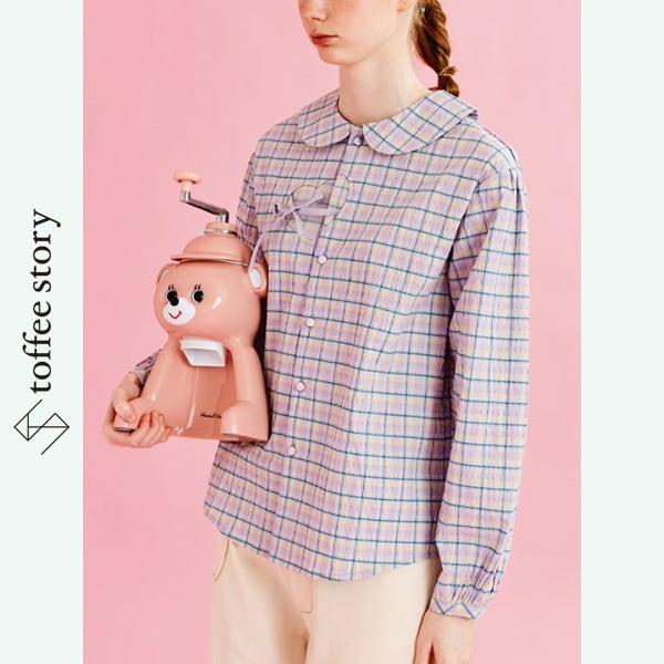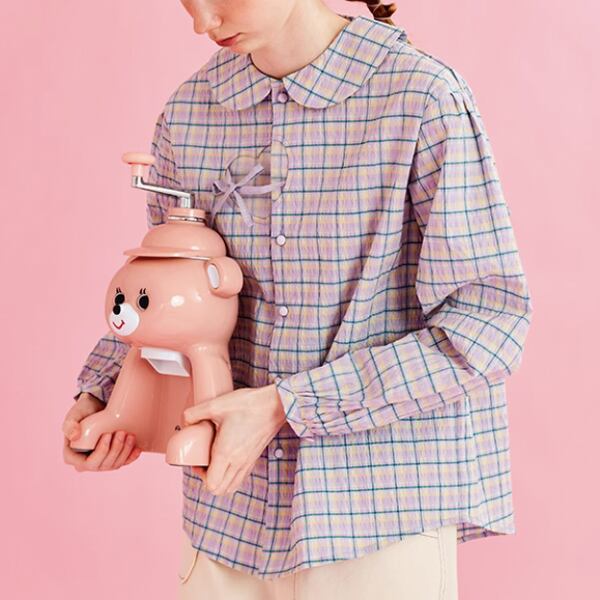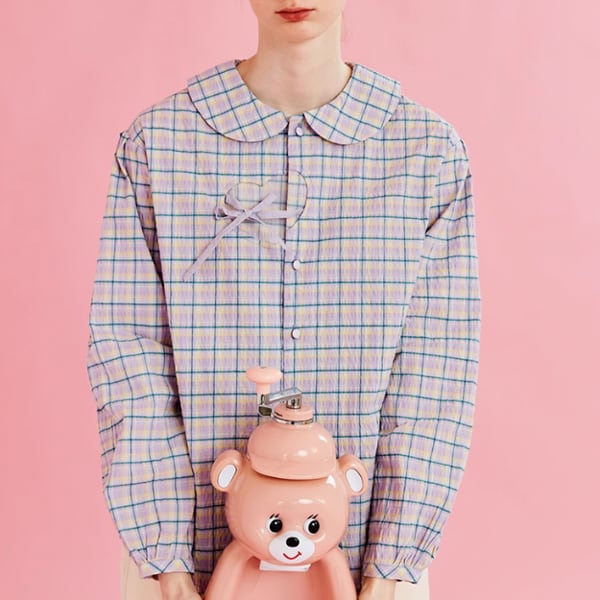 ぽこぽことした優しい質感の生地に、淡く甘いラベンダーチェック。丸い襟がやさしく首もとを包み、胸元にはハートをかたどったくり抜きとリボンがちょこんと並びます。どこかおとぎ話のワンシーンのような、静かな可愛さが香るデザイン。