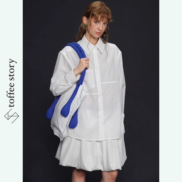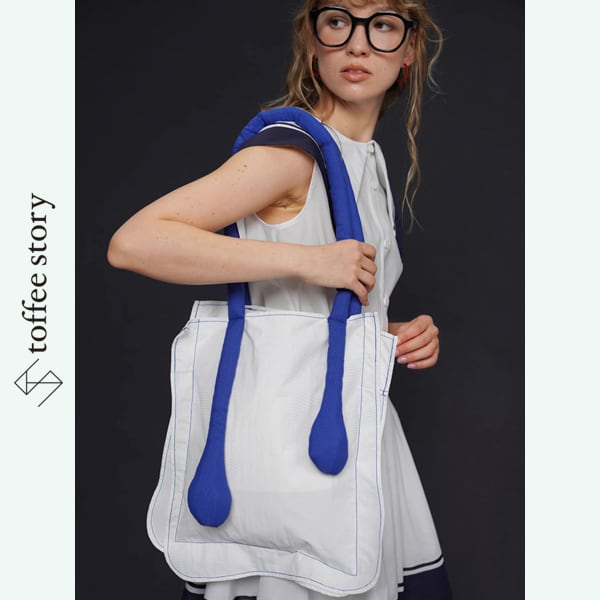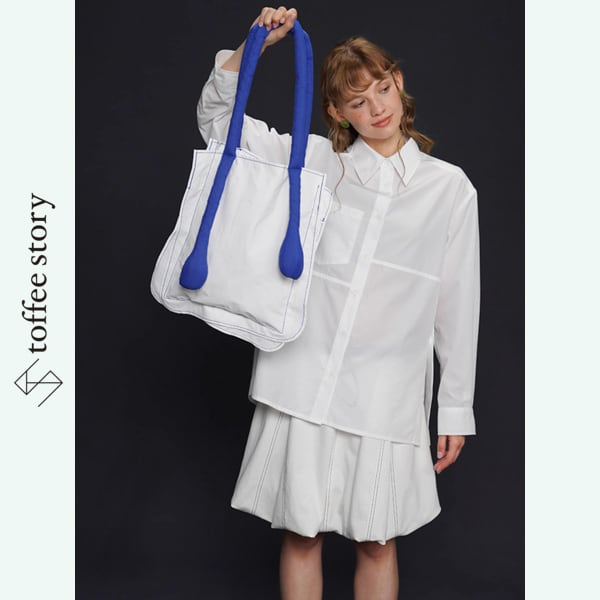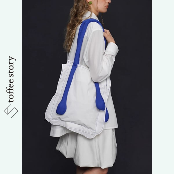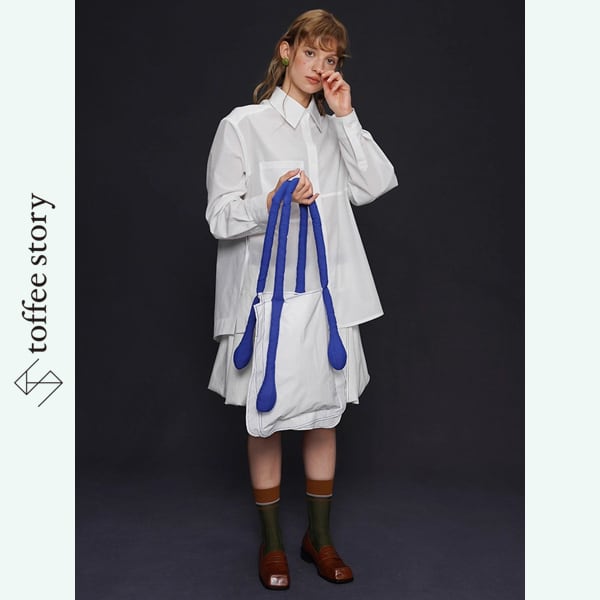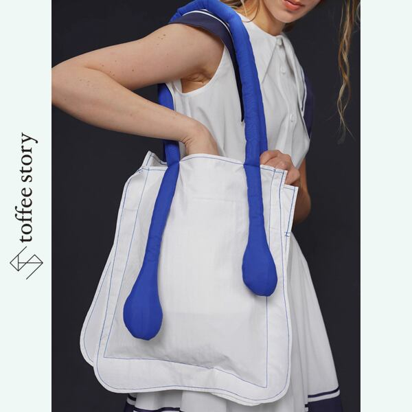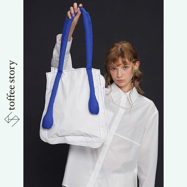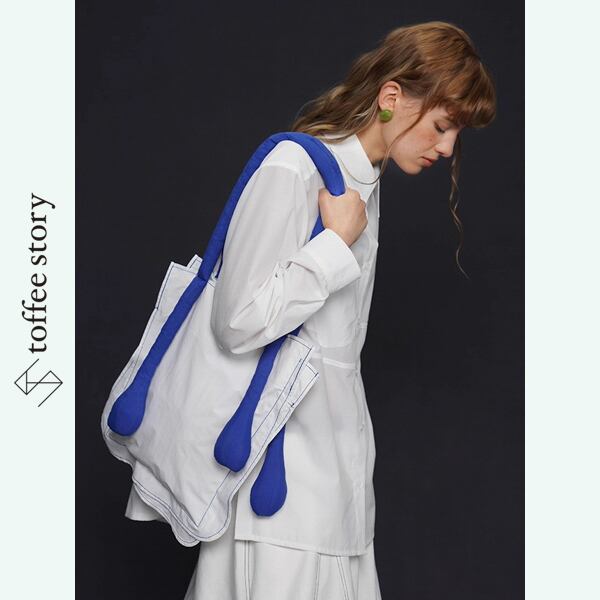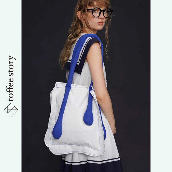 まるで夢の一場面を切り取ったような、アートショルダーバッグ。柔らかなホワイトの布地に、深い海のしずくのような青のストラップが印象的に揺れます。