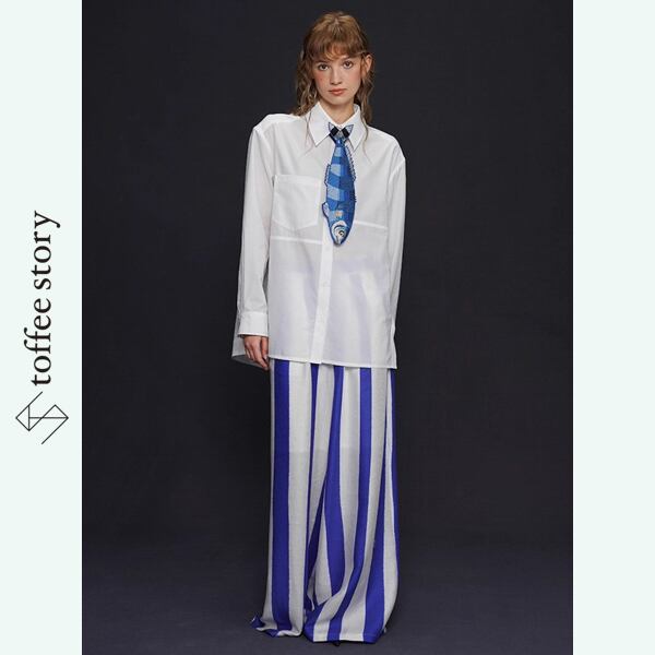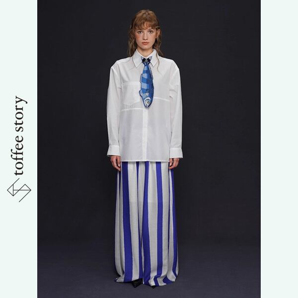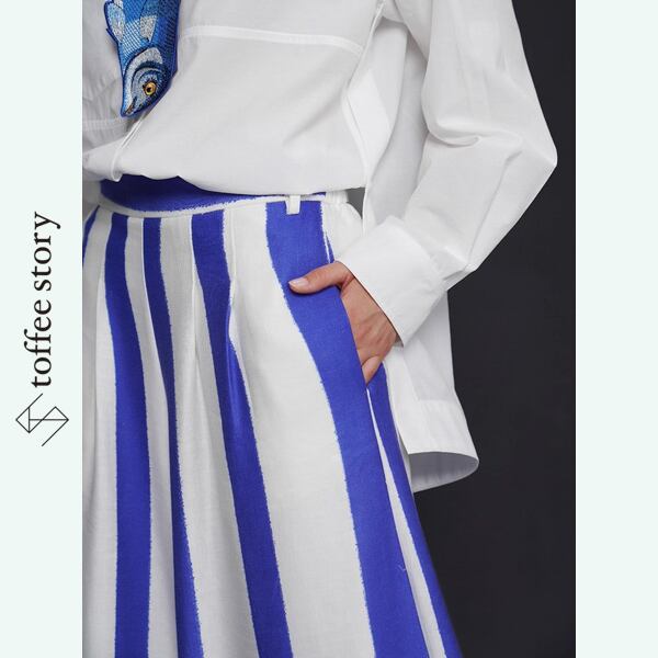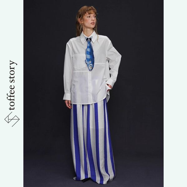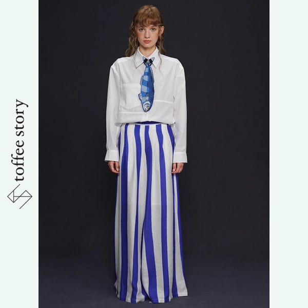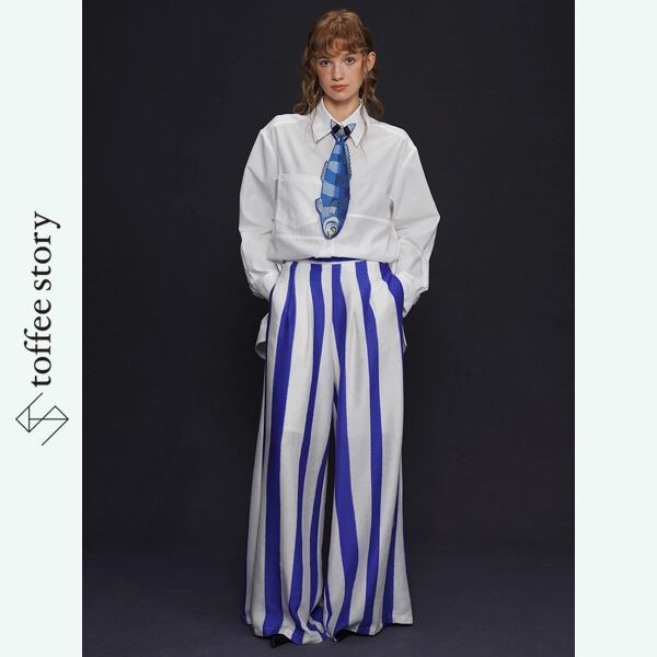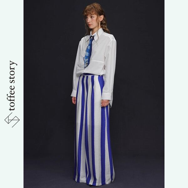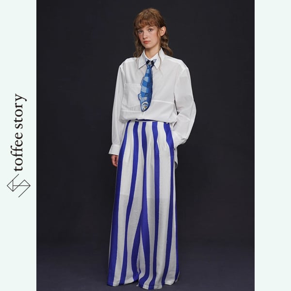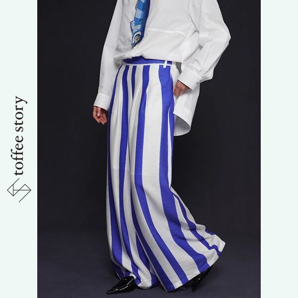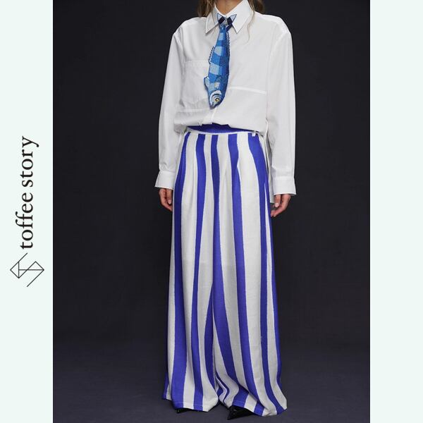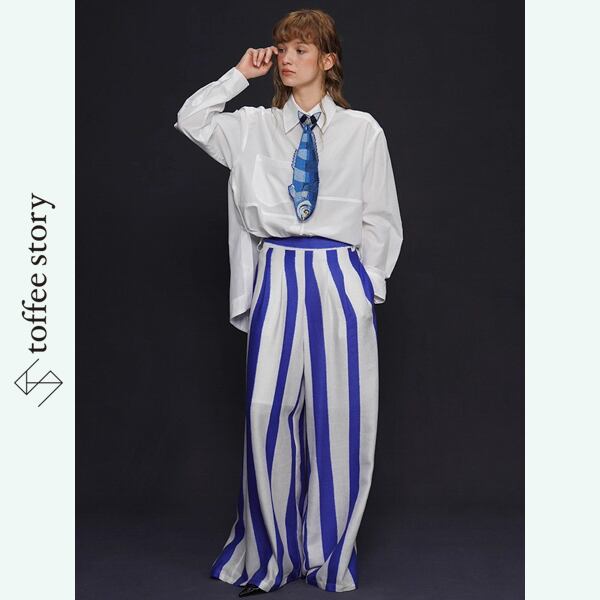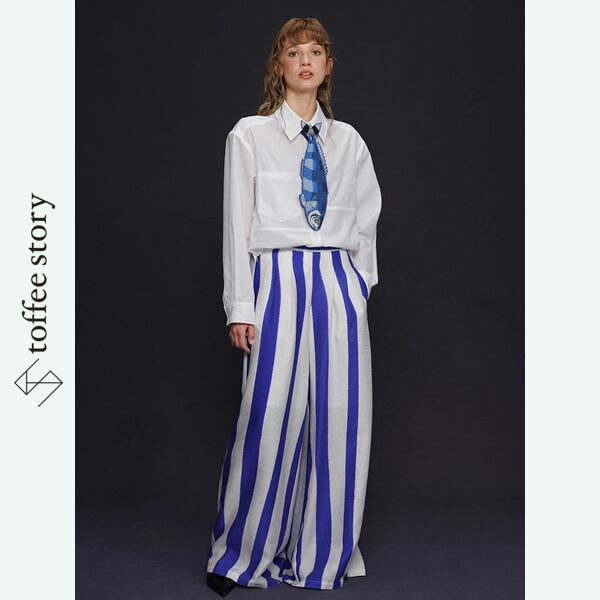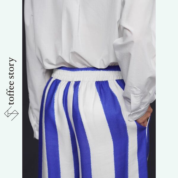 白と鮮やかな青のストライプが印象的なワイドパンツ。ゆったりとしたシルエットが、歩くたびに軽やかな揺れを生み、スタイリングにリズムを添えます。爽やかな配色は普段の装いに映え、シンプルなトップスと合わせるだけでコーディネートが完成。ベーシックでありながらアートな雰囲気を感じる一枚です。