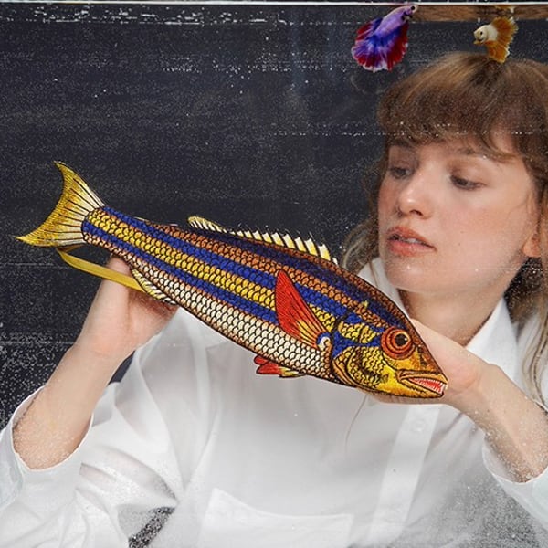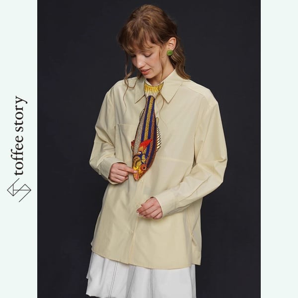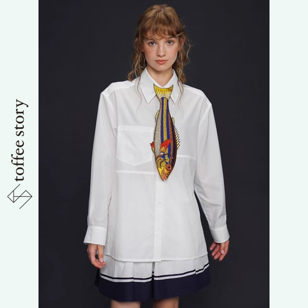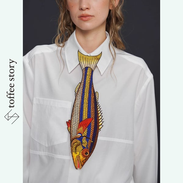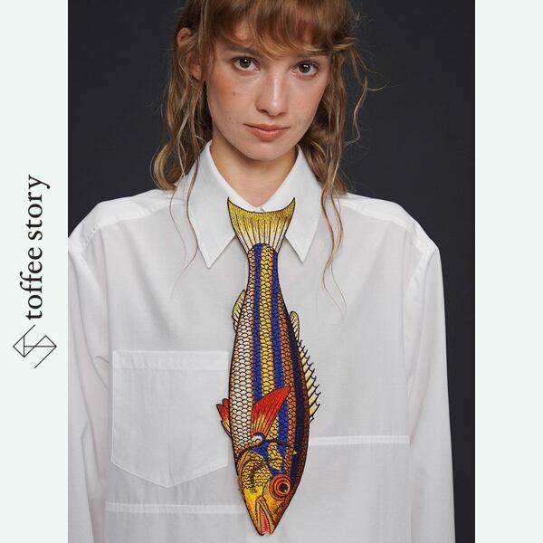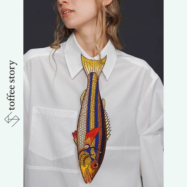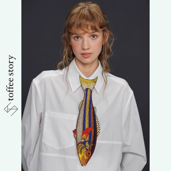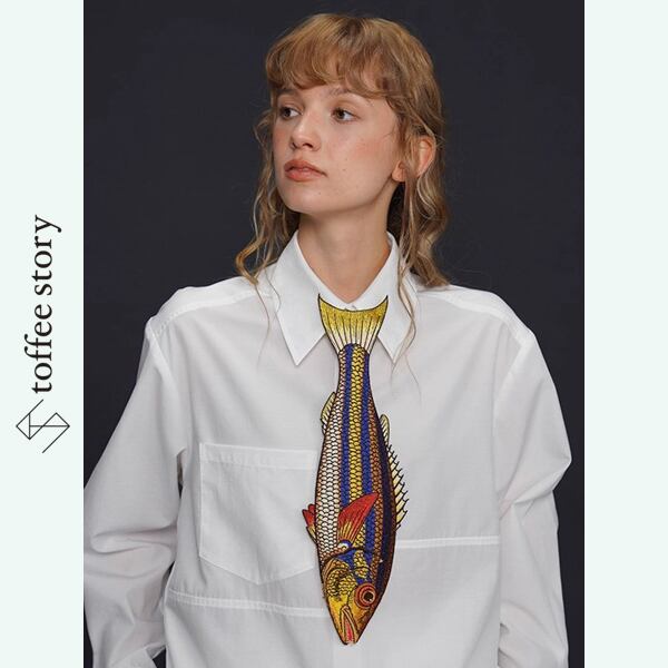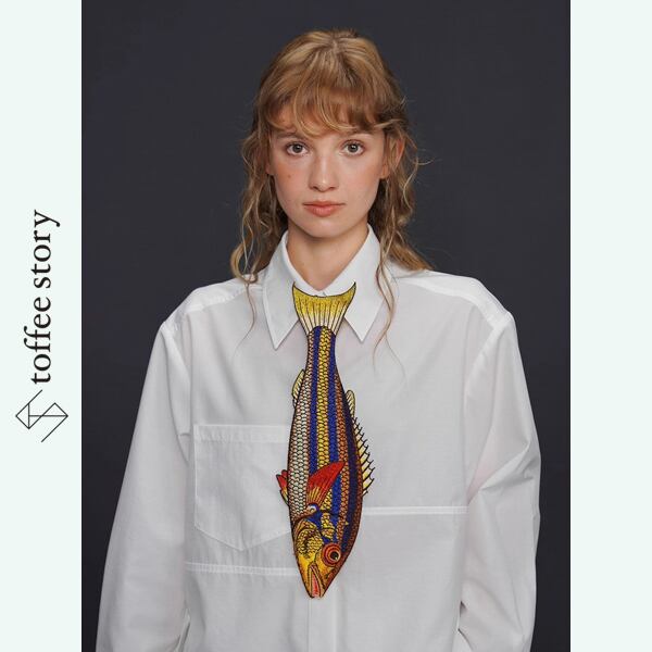 鮮やかな青と黄金色のコントラストが美しい魚モチーフのネクタイ。繊細な刺繍で描かれた鱗やヒレのディテールは、まるでアートピースのような存在感を放ちます。ベーシックな白シャツに合わせるだけで、コーディネートに遊び心と個性をプラス。大人のユーモアと品のあるデザインで、普段使いから特別なシーンまで幅広く活躍します。日常を詩的に彩るアクセントとしておすすめの一品です。