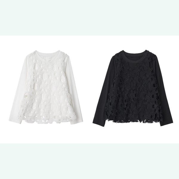 繊細な花柄レースを大胆に重ねた、imakokoniらしいアートなロングTシャツ。ブラックとホワイトの2色展開で、インナーにもメインにも使える万能アイテムです。ふんわり広がる立体レースが動くたびに表情を変え、コーデに遊び心をプラス。ストリート感と甘さが共存する、秋の装いにぴったりの1枚。環境に配慮した素材と丁寧な縫製で、着心地にもこだわりました。