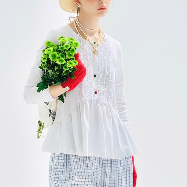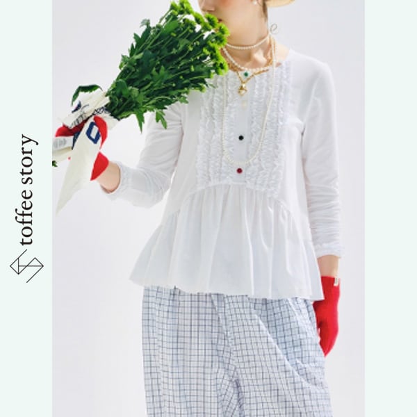 ふわっと広がる裾ラインに、胸もとのフリルとカラフルボタンが目を引く、imakokoniのホワイトフリルトップス。繊細なディテールの中に、色と遊び心を仕込んだアートな1枚です。ストリートにもナチュラルにも溶け込み、羽織るだけで感性が引き立つ存在感。環境に優しい素材と手仕事のぬくもりを感じられる、秋のおしゃれ心をくすぐるアイテムです。