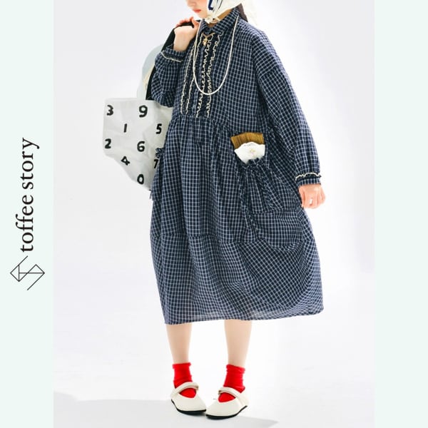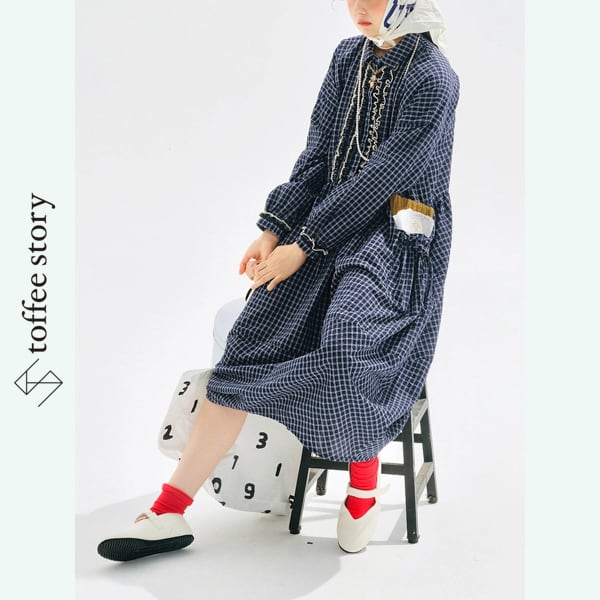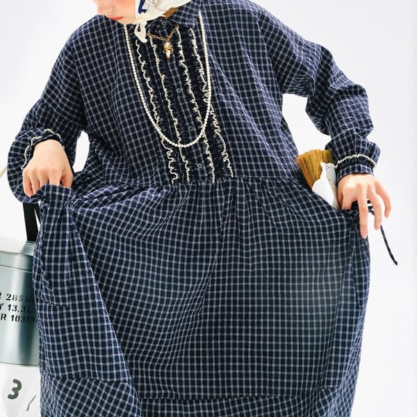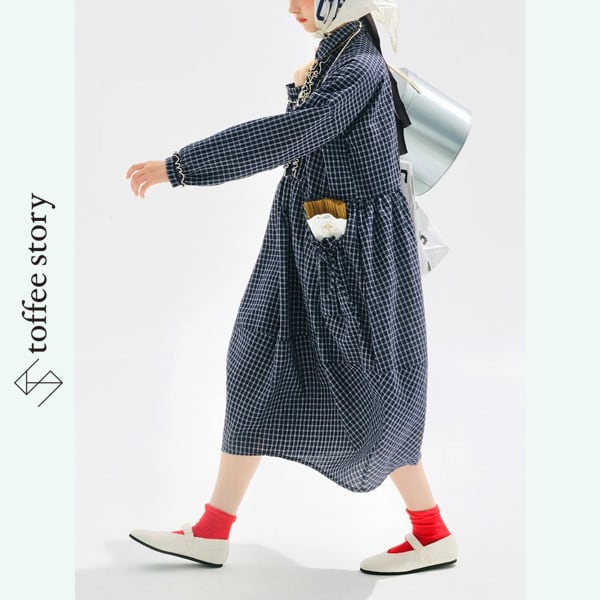 ふんわり丸みのある独特のシルエットが目を引くチェック柄ワンピース。細かなギャザーやドロストディテールが立体感を生み、どこか絵本の主人公のような雰囲気に。落ち着いたブルー系のチェックは、甘すぎず大人にもぴったり。スニーカーでストリート風に、タイツやブーツで季節感をプラスしても◎。一枚で着映えするこのワンピースで、今日のあなたが少し自由になれるかも。