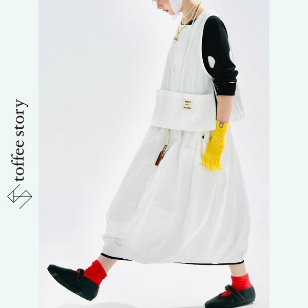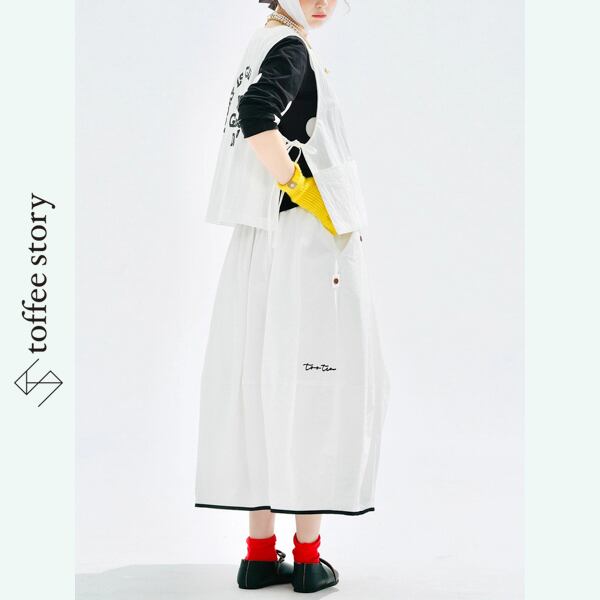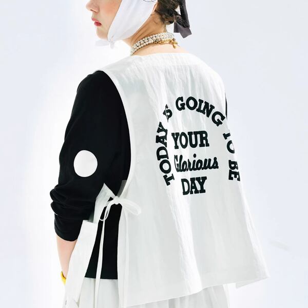 「TODAY IS GOING TO BE YOUR Glorious DAY」―背中いっぱいのメッセージが、今日をちょっと特別にしてくれるホワイトベスト。軽やかなコットン混素材に、サイドリボンと大きめポケットで遊び心と実用性をプラスしました。ゆったりシルエットだから重ね着もラクラク。TシャツやロンT、ワンピースに合わせてカジュアルに楽しめます。裾パイピング×丸みシルエットのスカート(i0731)とのセットアップもおすすめ。imakokoniらしいアート感とストリートカジュアルが光る、デイリーコーデの主役級アイテムです。