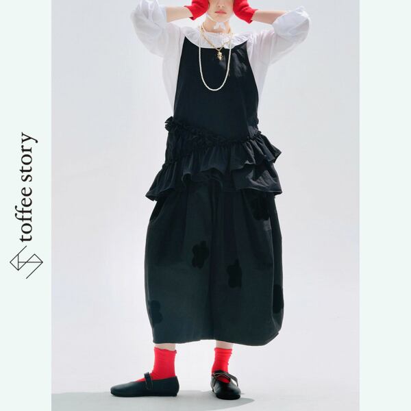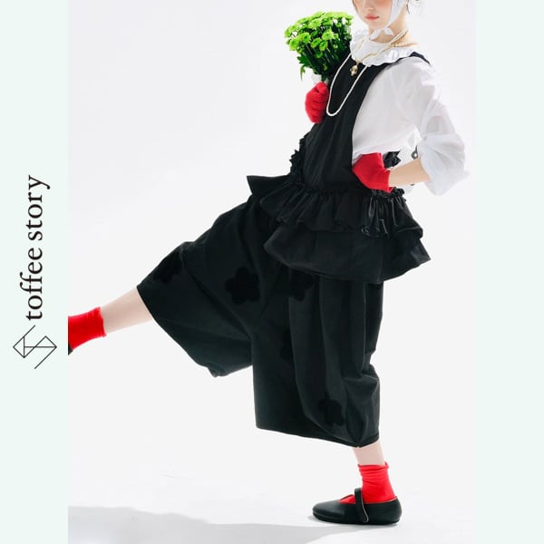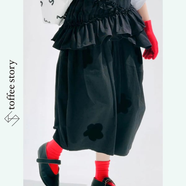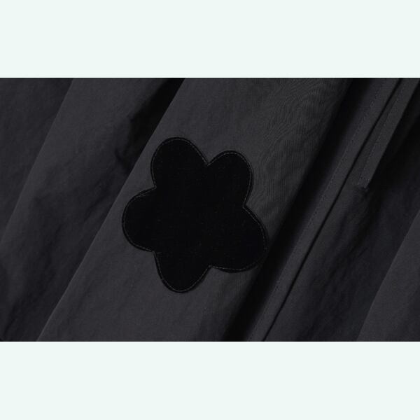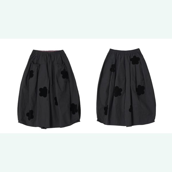 深みのある黒地に、ふんわり咲いたフラワーパッチワークが映えるゆったりスカート。imakokoniらしいアート感と遊び心が詰まったデザインで、見るたび・着るたびに気分が上がります。軽やかなコットン混素材は柔らかく、動くたびに自然なふくらみと揺れ感を演出。ウエストは総ゴム仕様でらくちん、両サイドの大きめポケットも嬉しいポイント。スニーカーでカジュアルに、ブーツでモードに…どんなスタイルにも溶け込みながら、個性を引き立ててくれる一枚です。