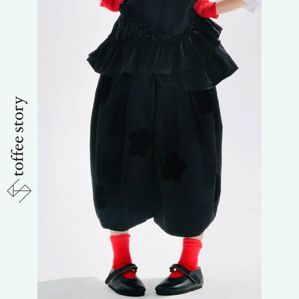 黒地に咲くフラワーパッチ ゆったりスカート 《i0734》
