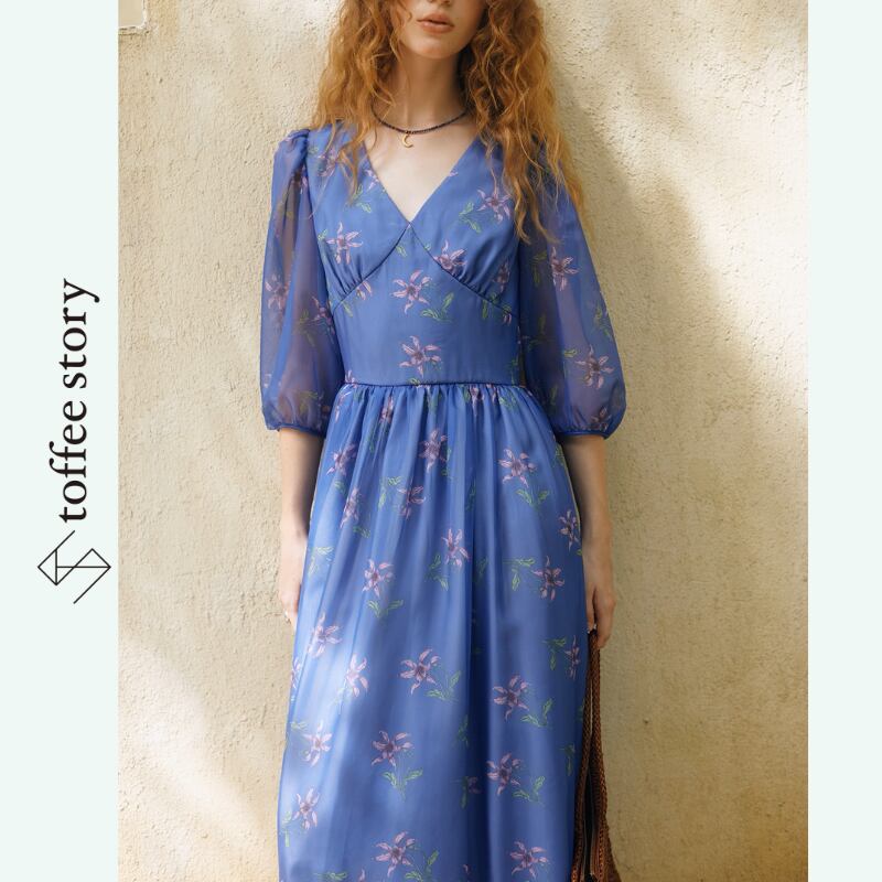 軽やかなシアー素材に紫の小花柄を散りばめ、そよ風を感じるようなエアリーな着心地を叶えました。柔らかなパフスリーブと美しいマキシ丈が、優雅でロマンティックな雰囲気を演出。リゾートシーンや特別な日のお出かけにも、さりげないアート感を纏える一枚です。