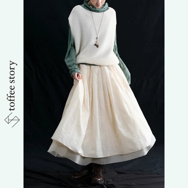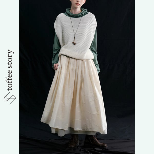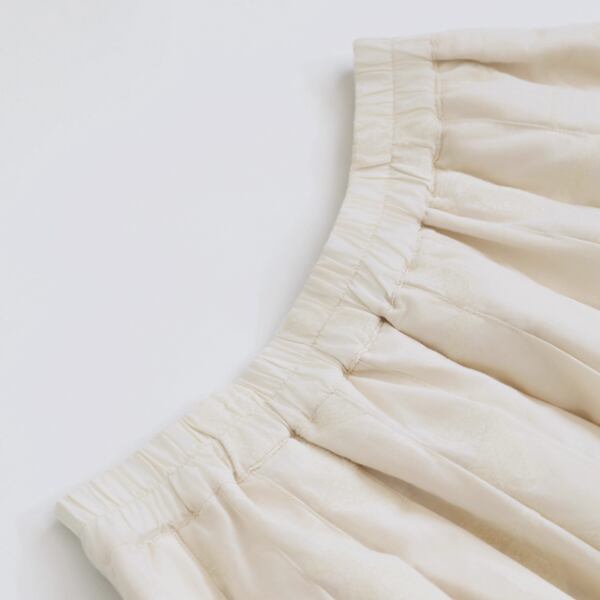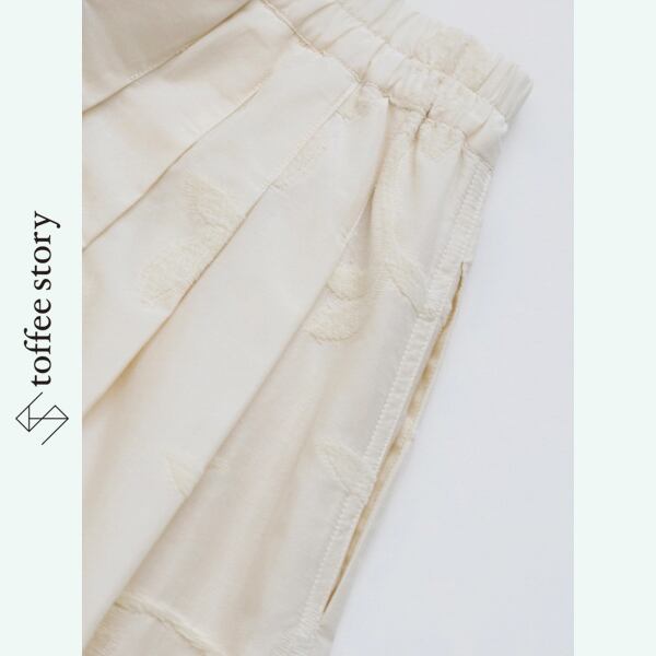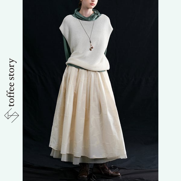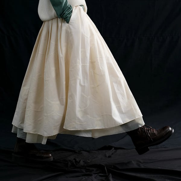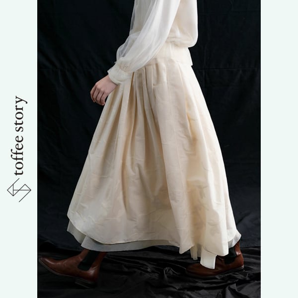 ふんわりと揺れるベージュのスカートに、同色の糸でそっと描かれたフラワーモチーフ。まるで陽だまりに落ちた影絵のように、繊細で控えめな美しさを纏います。二重仕立ての贅沢な生地感が生み出す柔らかなボリュームと、アートのような佇まい。ニットやシャツとのレイヤードで、秋の詩情を奏でてみてください