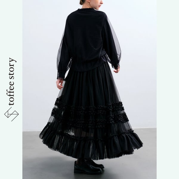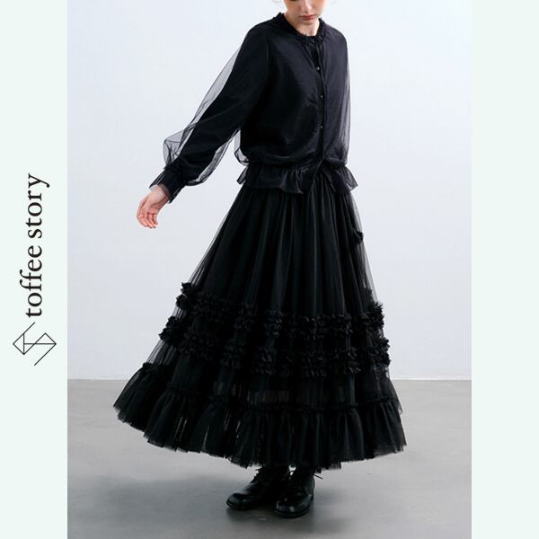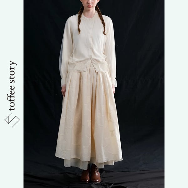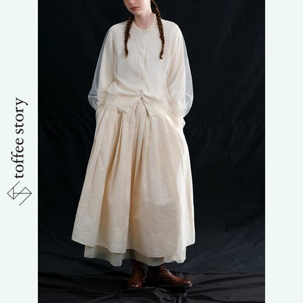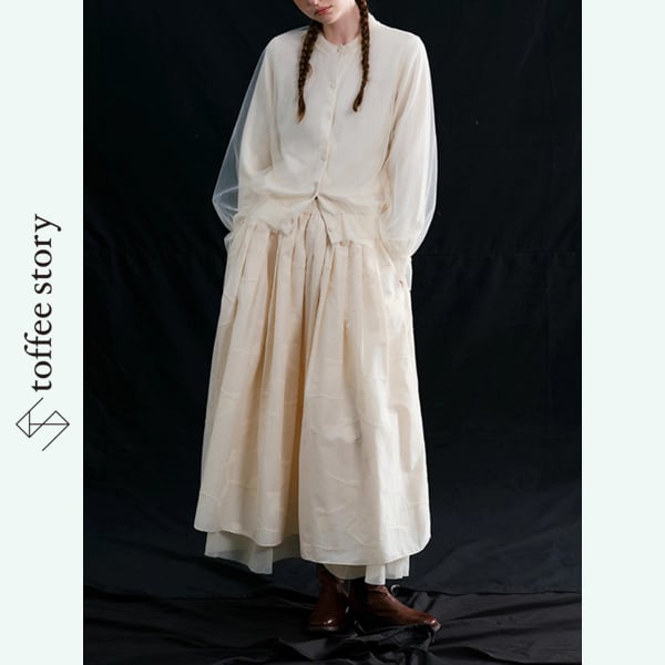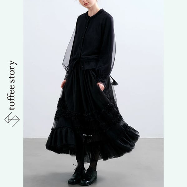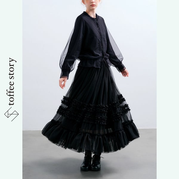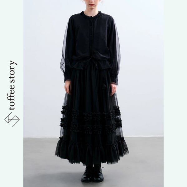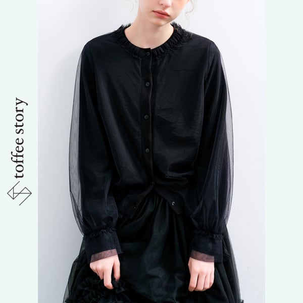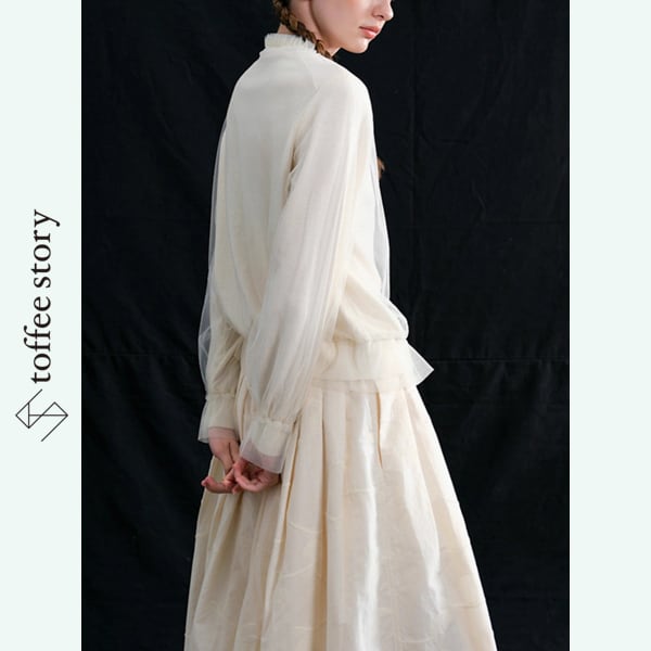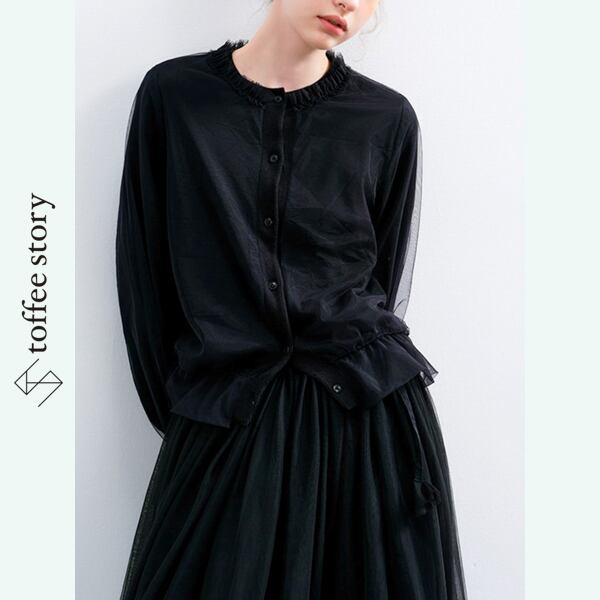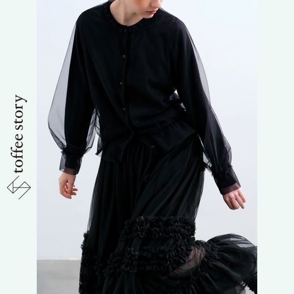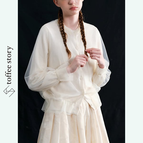 繊細なチュールを重ねて仕立てた、空気をまとうようなカーディガン。光をやさしく透かす袖のチュールと、シンプルなボディとのコントラストが、可憐さと静けさを同時に纏わせます。首元や袖口にはさりげないギャザーが施され、少女の頃の記憶がふわりと蘇るよう。