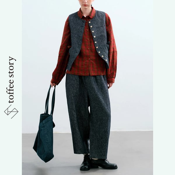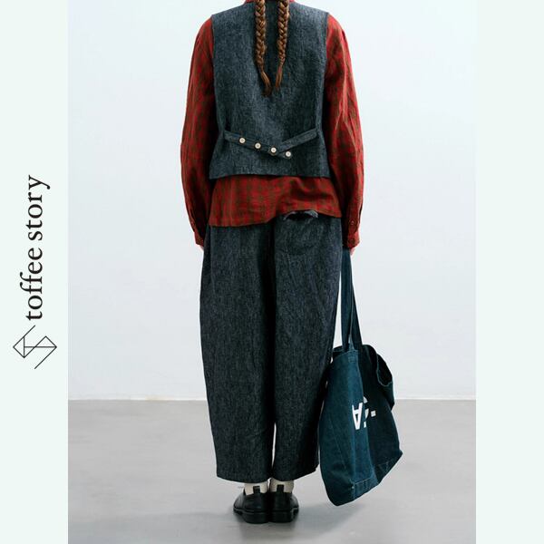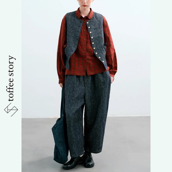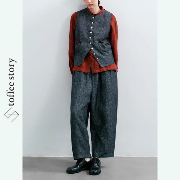 ベストの洗練されたカッティングと、パンツのリラックス感あるシルエットが、秋のはじまりにちょうどいい。