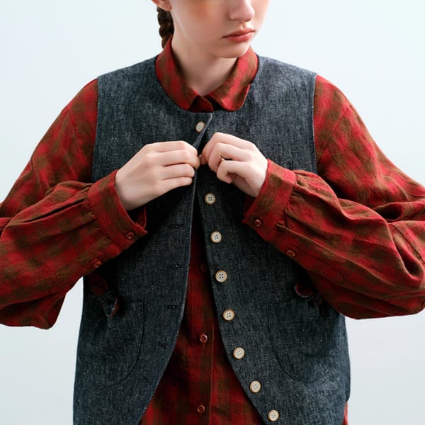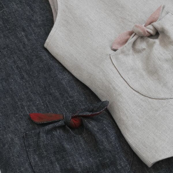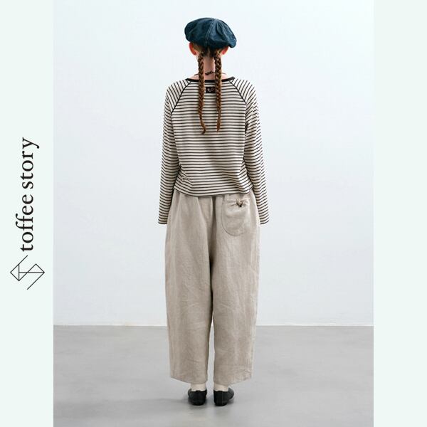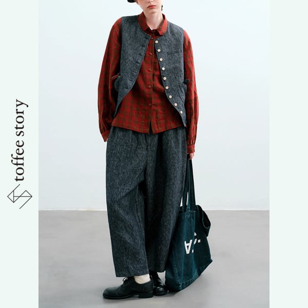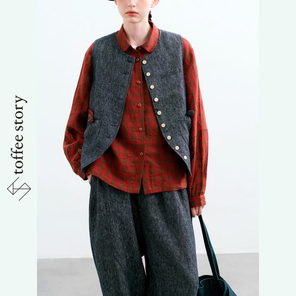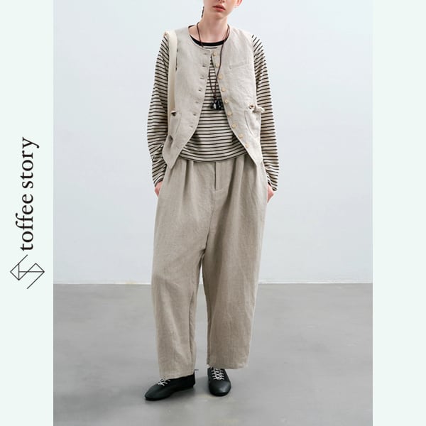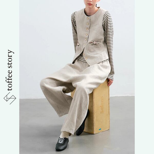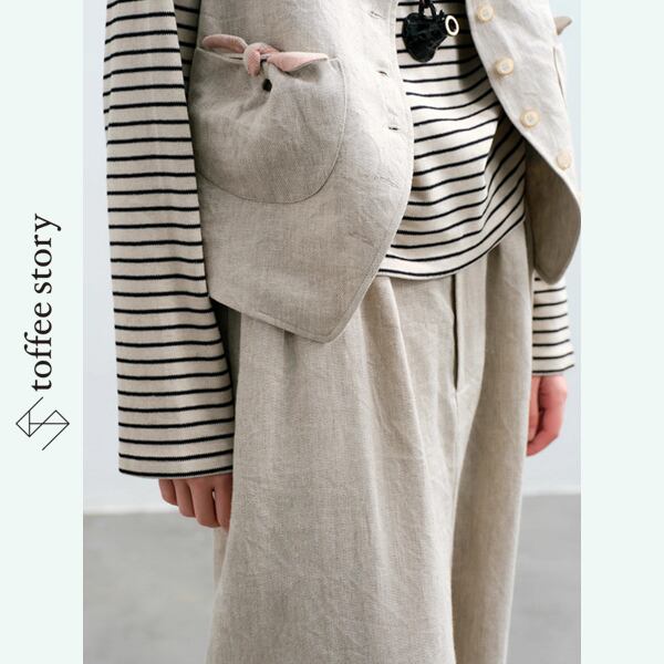 天然ヘビーリネンの優しい風合いが、着るたびに肌になじみ、ナチュラルな存在感を引き立てます。