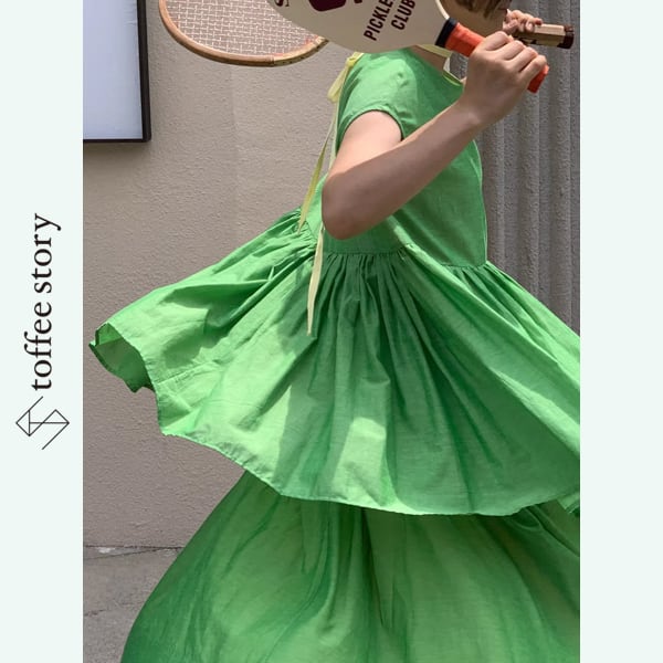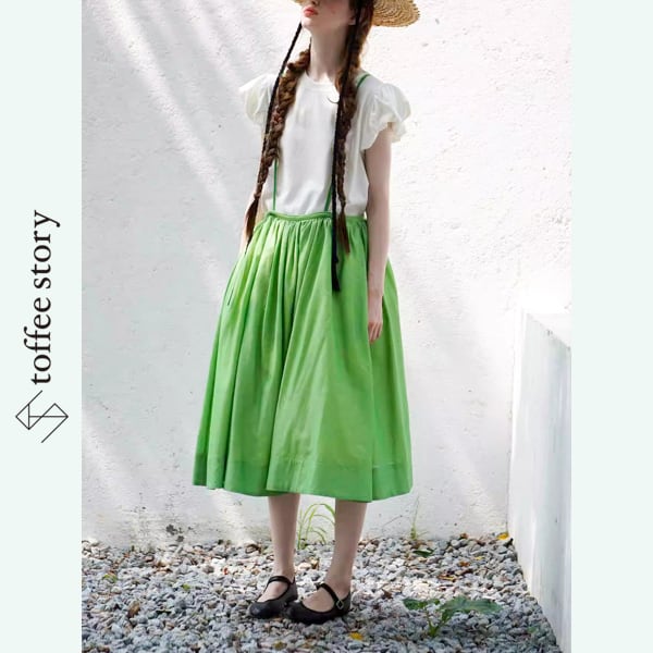 初夏の陽光をたっぷり浴びた草原を思わせる、鮮やかなグリーンのサスペンダースカート。