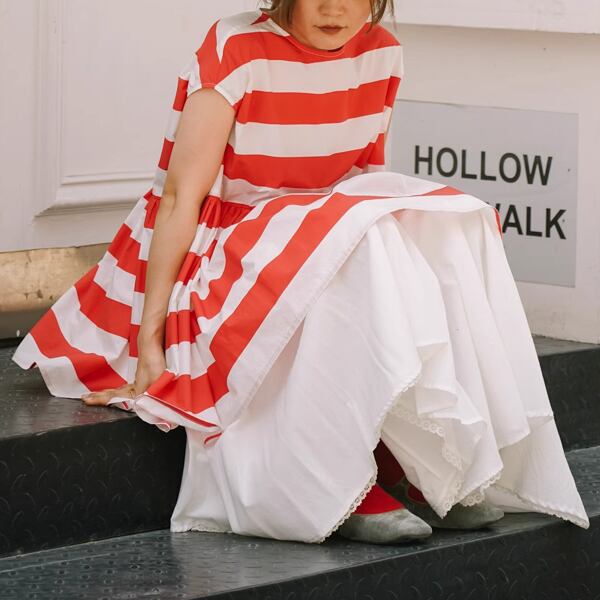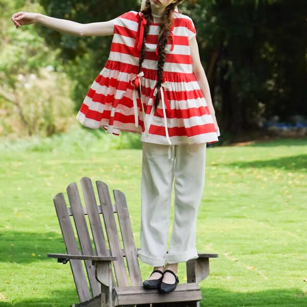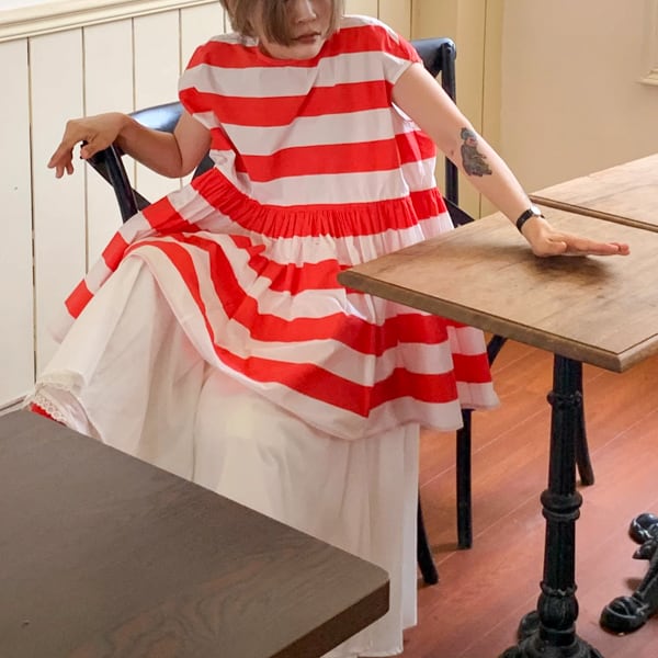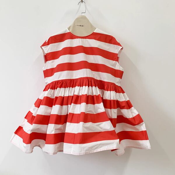 赤と白の太めのボーダーが陽射しに映え、たっぷりと寄せられたギャザーがふんわりと広がるシルエットを描きます