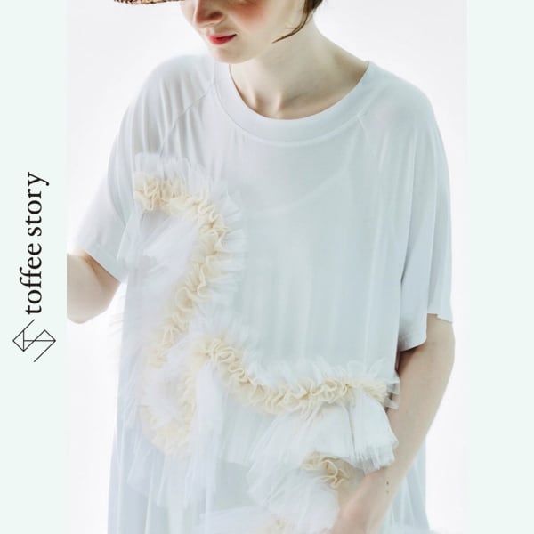 やわらかなホワイトに、繊細なチュールが折り重なるようにあしらわれたサマーワンピース