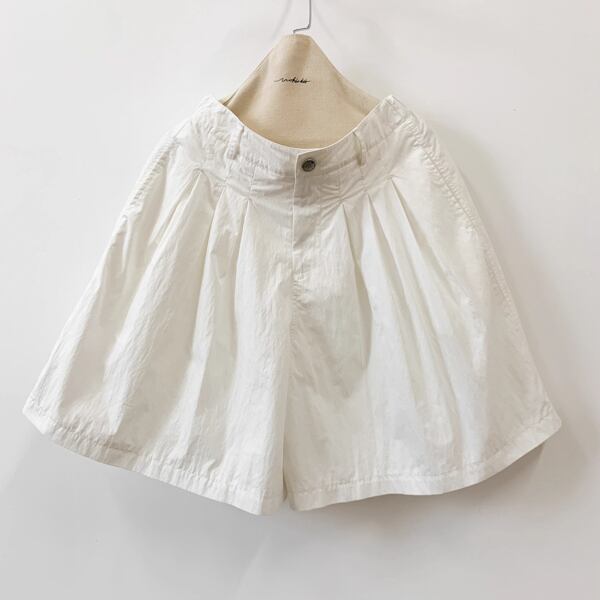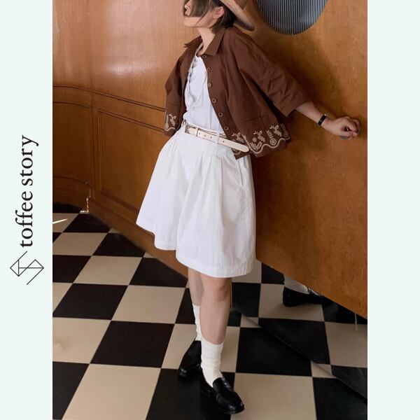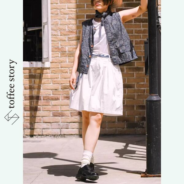 散歩道を軽やかに歩く情景が似合うフレアショートパンツ。膝上丈のゆったりと広がるシルエットは、スカートのような優雅さを持ちながらも動きやすく、デイリーにも旅先にもぴったりです。ネイビーブルーは凛とした海風を、ホワイトは陽だまりのやさしさを纏います。ブラウスと合わせてレトロに、Tシャツでカジュアルに——どんなコーデも映画のワンシーンに変えてくれる一着です。