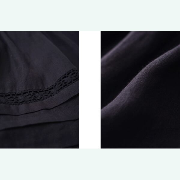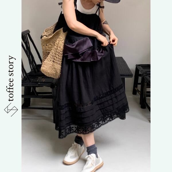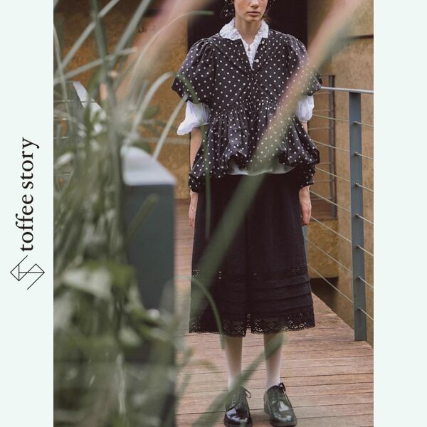 石畳の街角に溶け込むようなブラックスカート。裾にあしらわれた繊細なレースとタックが、歩みのたびに静かなリズムを刻みます。控えめな広がりが大人の落ち着きを漂わせつつ、どこかレトロな甘さも感じさせる一着。白シャツを合わせればクラシックな気品を、ドットブラウスを合わせれば映画のワンシーンのような華やかさを演出します。昼下がりのカフェから夜の散歩まで、纏う時間と共に表情を変える、物語の続きのような一枚です。