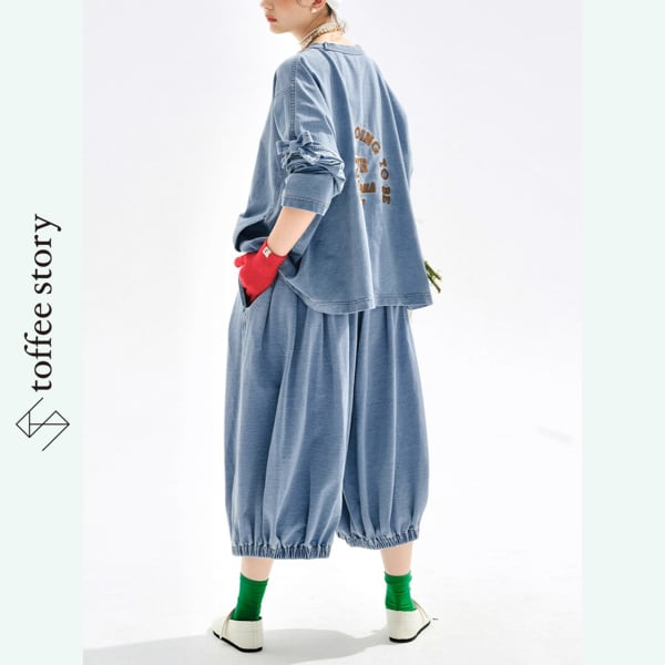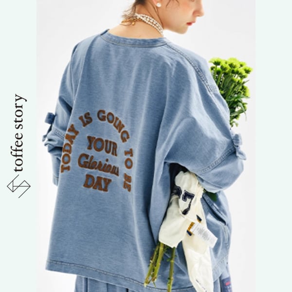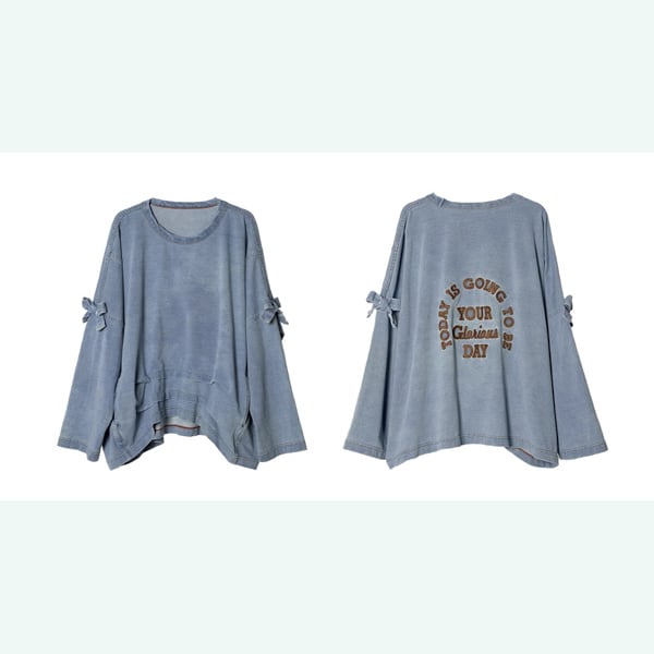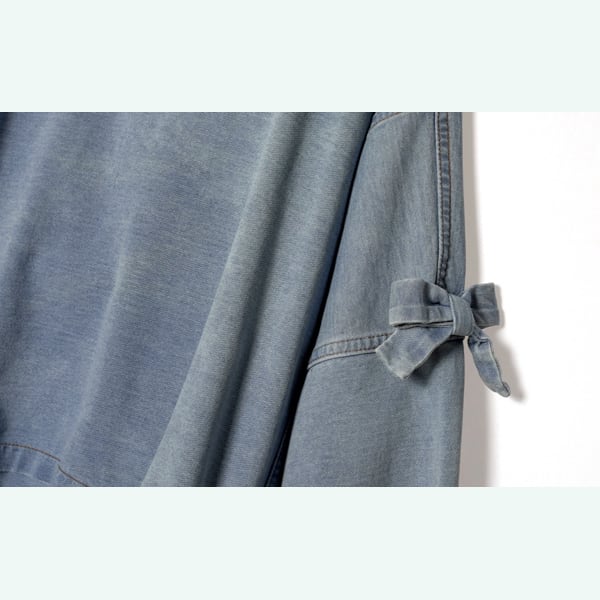 袖にちょこんと結んだリボンと、背中のロゴ刺繍がポイントのデニム風カットソー