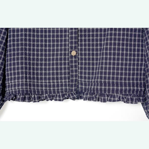 ネイビーチェックにひそむリボンディテールが、さりげなく視線を集めるシャツ