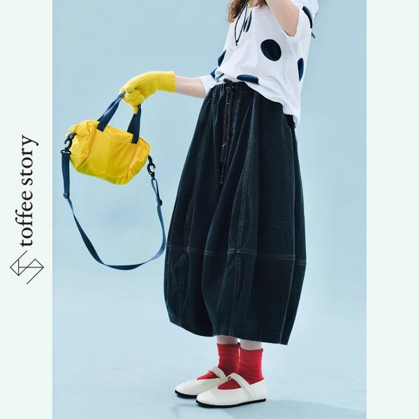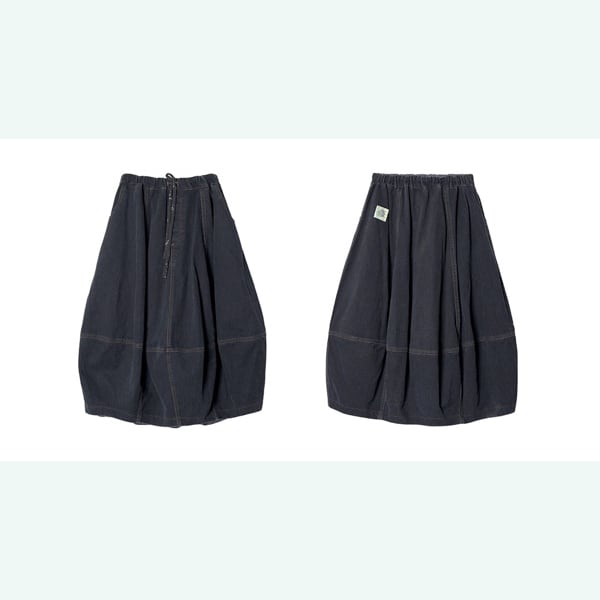 ゆったりとしたシルエットに、ほんのりとランタンのような膨らみを描くデニムスカート