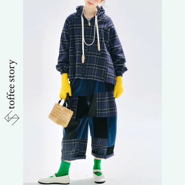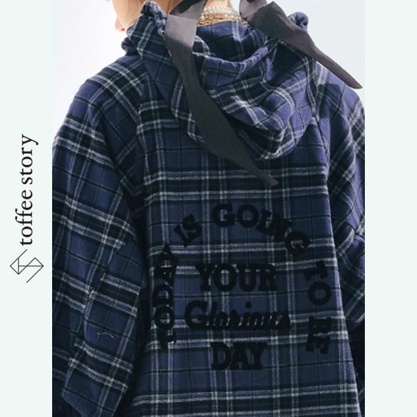 imakokoni らしいストリートとカジュアルの融合が光る、チェック柄フーディー。フロントはシンプルながら、背面には「TODAY IS GOING TO BE YOUR GLORIOUS DAY」のポジティブなメッセージをオン。ゆったりシルエットと大きめフード、長めのドローコードが遊び心をプラスします。デイリーに寄り添いながらもアートのような個性を感じさせる一枚。気分を上げたい日常にぴったりのパーカーです。