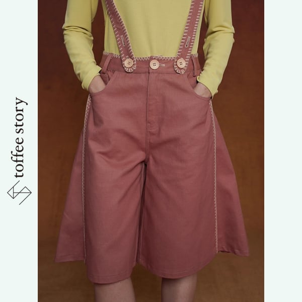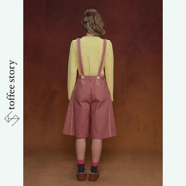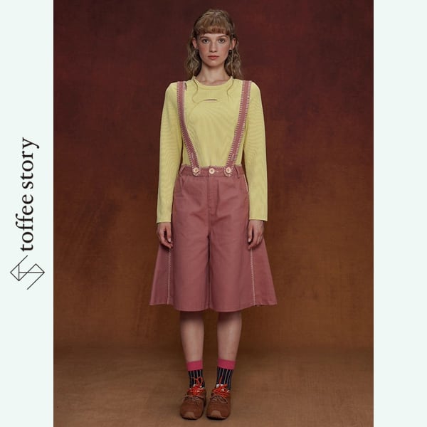 柔らかな風合いのコットン地にステッチが映え、物語の中で主人公が纏うような存在感を放ちます。肩から落ちるストラップとウエストのボタンディテールが、どこかレトロな詩情を漂わせ、歩くたびに自然体のリズムを刻みます。