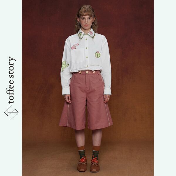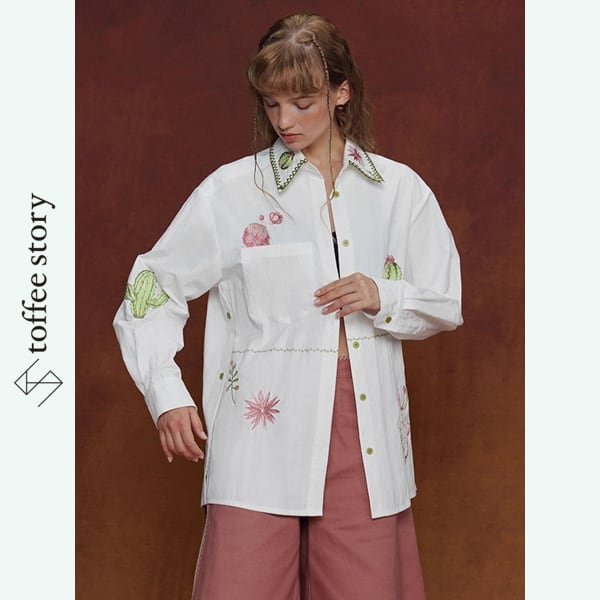 胸元や襟にあしらわれたサボテンと花の刺繍は、旅の途中で見つけた小さなオアシスを思わせ、物語を紡ぐような存在感を放ちます
