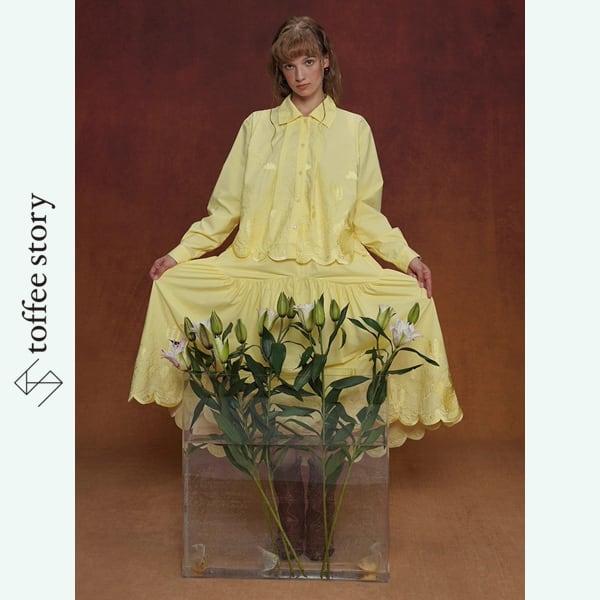 朝の光をそのまま纏ったような、やわらかなイエローのセットアップ。