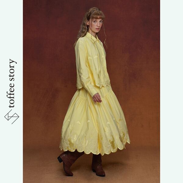 トップスとスカートに施されたサボテンと草花の刺繍は、砂漠に咲く小さな庭園の風景を思わせ、装いに物語の一幕を添えます。裾のスカラップラインが揺れるたび、詩情あふれるリズムを描き出し、歩く姿に軽やかな余韻を残します。
