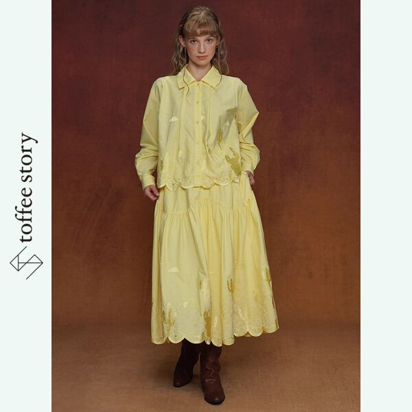 朝陽の庭園、サボテン刺繍イエローセットアップ 《C0246》