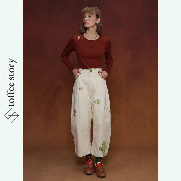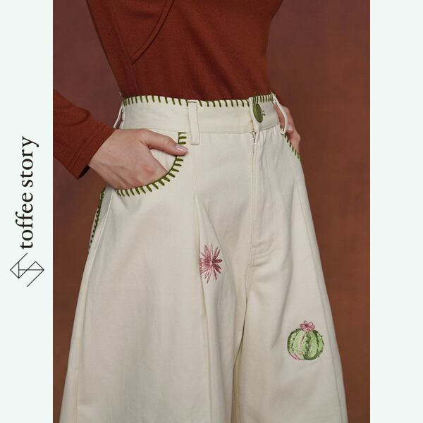 遊び心たっぷりのサボテン刺繍が、コーディネートをぱっと明るく彩るワイドパンツ。