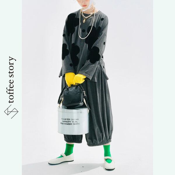 裾のゴム仕様がふんわりとしたシルエットを生み出し、歩くたびにユニークな動きを演出します。