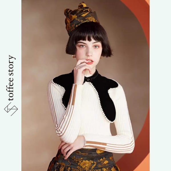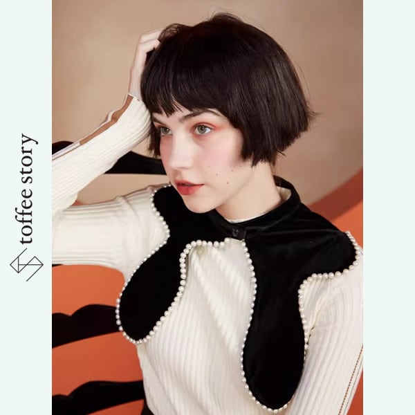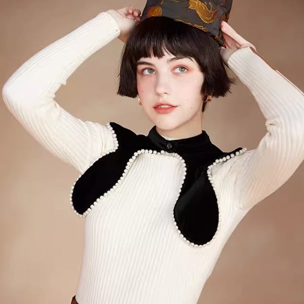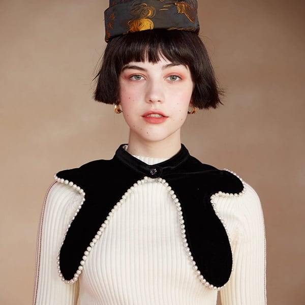 漆黒のベルベットに沿って並ぶフェイクパールが、夜空に瞬く星々のように輝くつけ襟