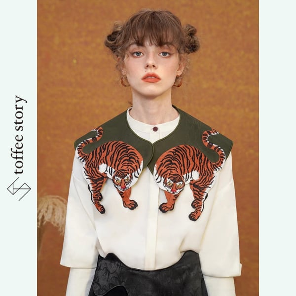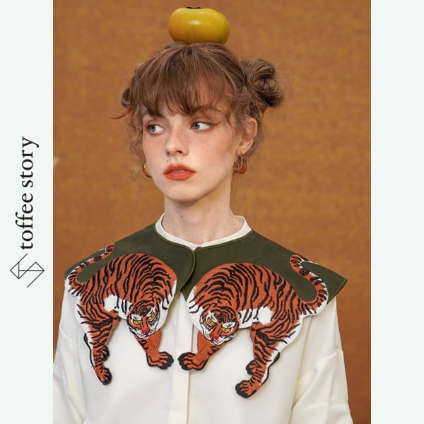 勇ましくも美しい虎の刺繍が目を惹く、存在感たっぷりのつけ襟