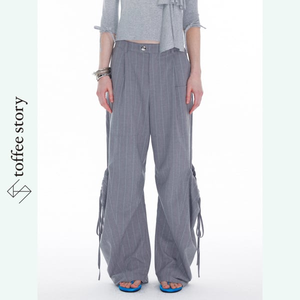 ミニマルなグレーにストライプを走らせたワイドパンツは、シンプルさの中に前衛的な仕掛けを潜ませています