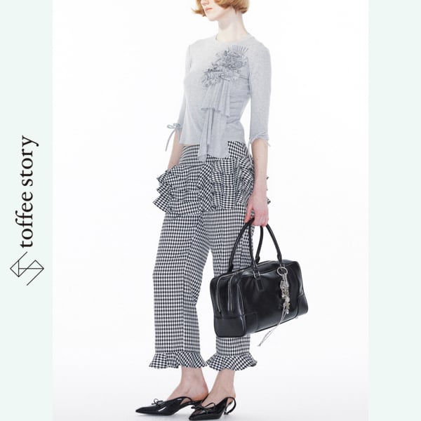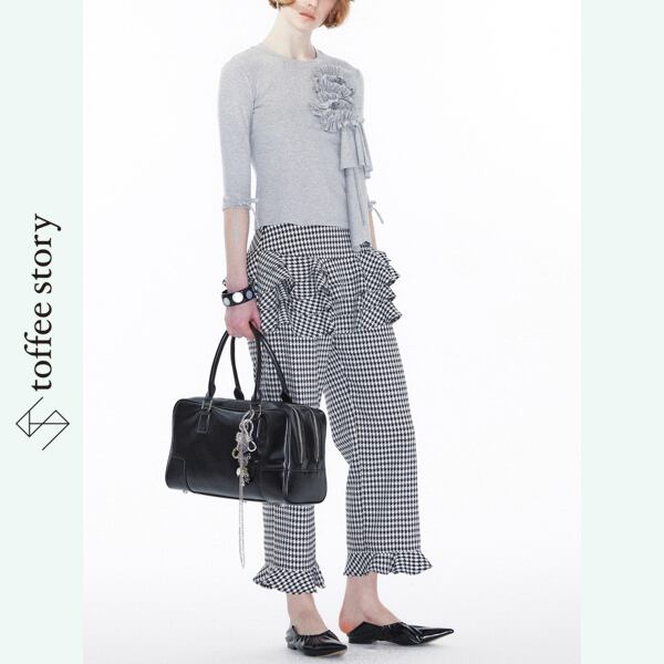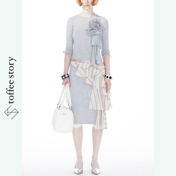 落ち着いたグレーのボディに、アートピースのようなフリルを重ねたミドルスリーブトップス
