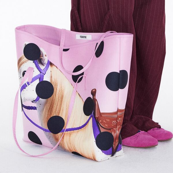 かわいいはずのモチーフを大胆に配置することで、甘さとシュールさが同居するトートバッグに