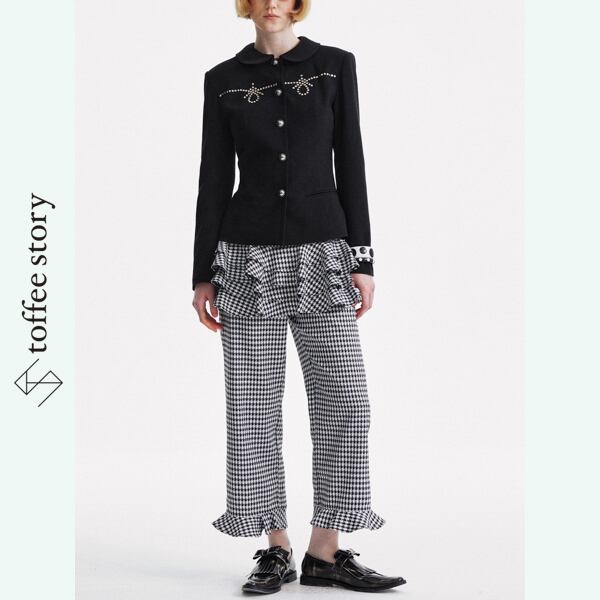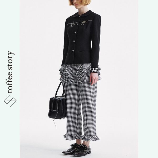 かっちりとしたフォルムが大人っぽさを引き立てつつ、胸元のきらめきがポップなムードを演出