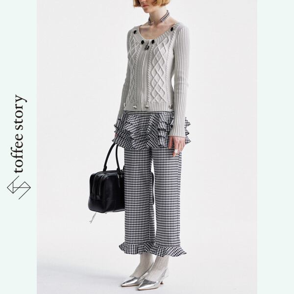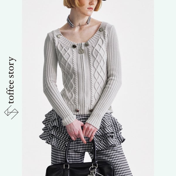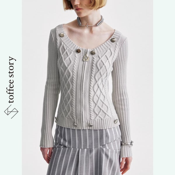 クラシカルなケーブル編みに、存在感たっぷりのメタルボタンを散りばめたアバンギャルドな一枚