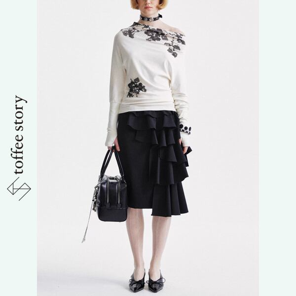 大胆に重ねられたフリルがリズムを刻むように揺れる、存在感抜群のブラックスカート