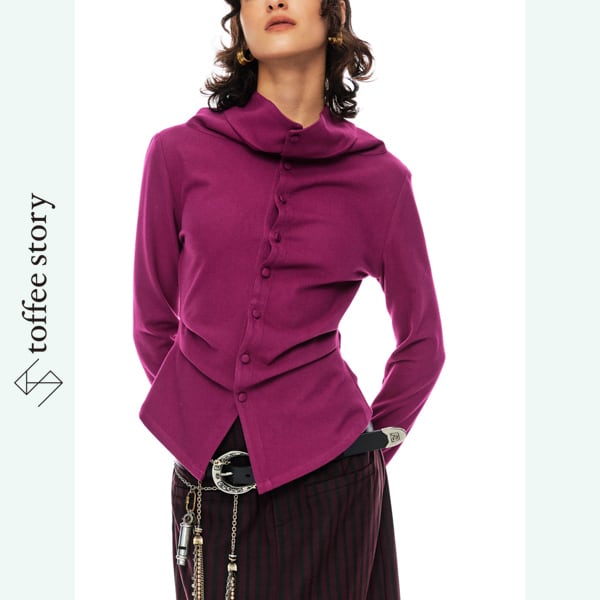 鮮やかなラズベリーカラーが視線を奪う、アシンメトリー仕立てのトップス