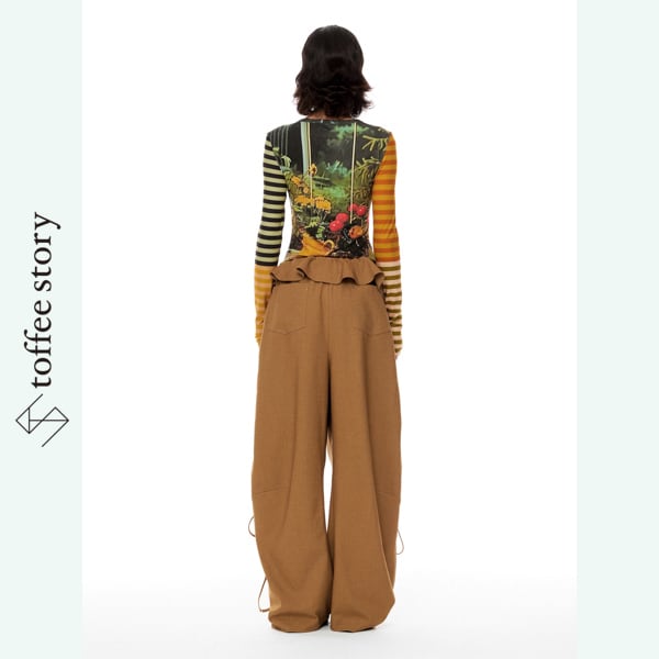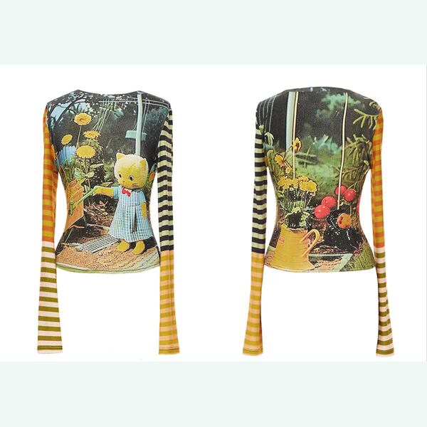 子猫が庭で遊ぶノスタルジックなプリントに、アシンメトリーなストライプスリーブを掛け合わせた一枚です