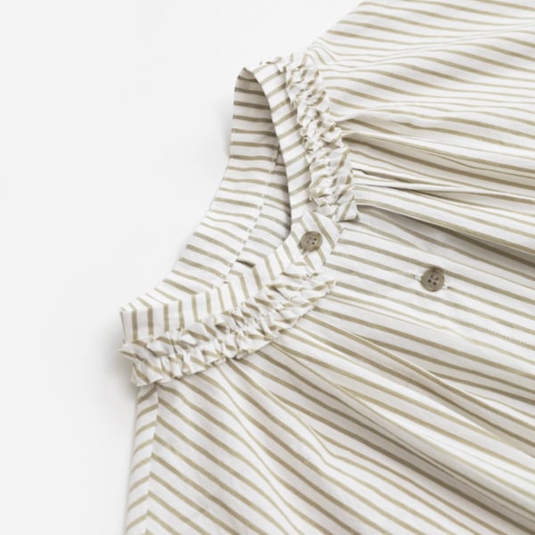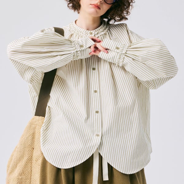 繊細なストライプに、首元と袖口のフリルを添えたクラシックなブラウス