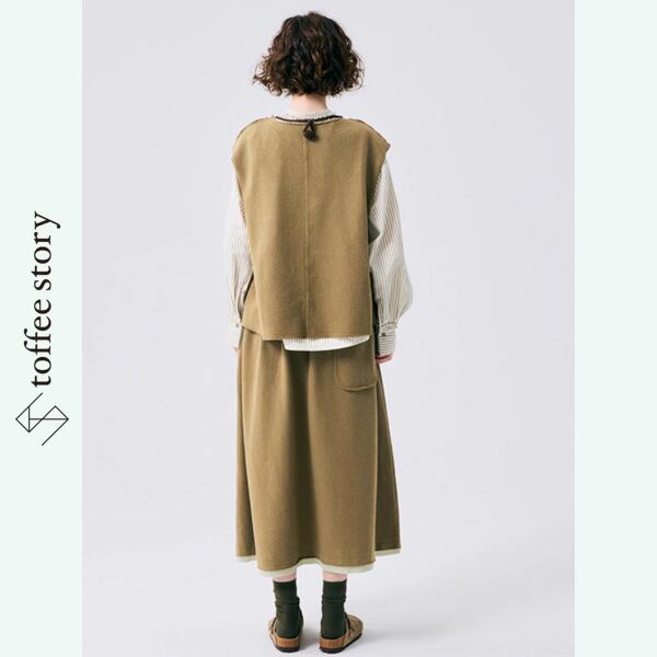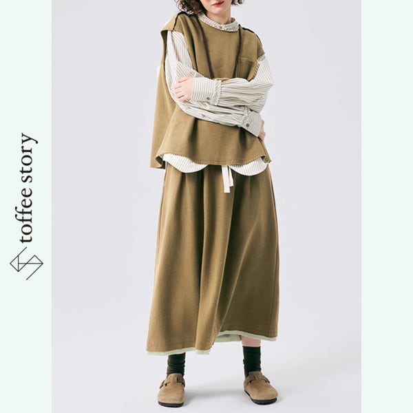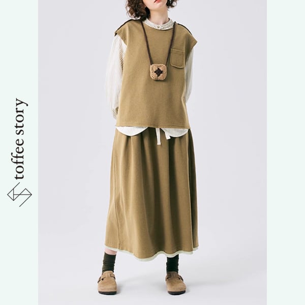 シンプルなニットベストと、ドローストリングで表情を変えるスカートが重なり合うセットアップ