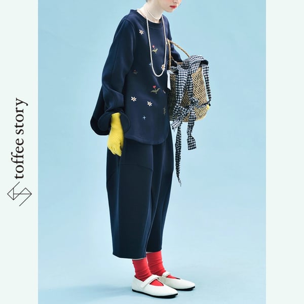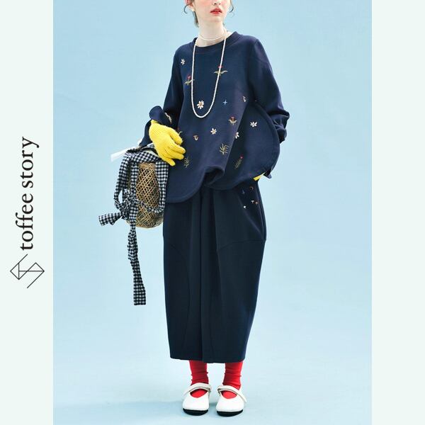 同シリーズの「ペタルヘム・咲き誇るトップス i0781」や「小花ときらめきの刺繍ブルゾン i0758」と合わせれば、まるでセットアップのように統一感ある着こなしが完成。単品でもセットでも、秋冬のスタイリングに新鮮なリズムを生み出す一本です。