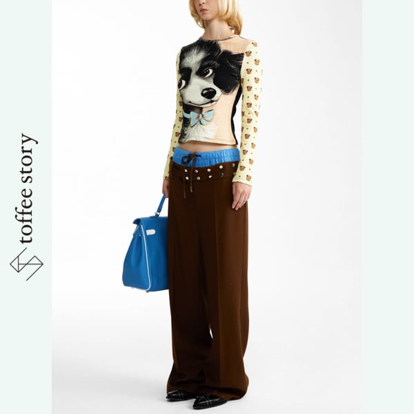 低めに配したウエストラインと大胆なベルト装飾が、クラシカルでありながらも前衛的な存在感を放ちます
