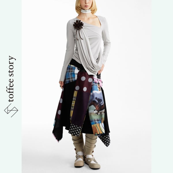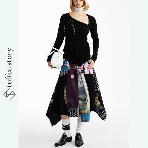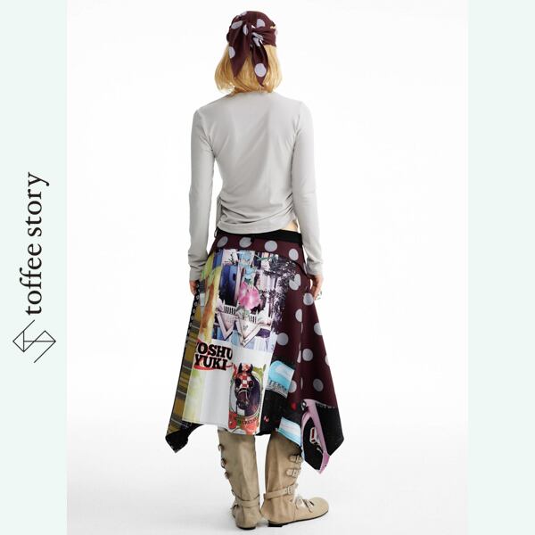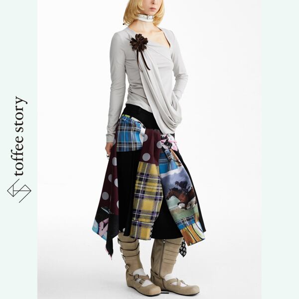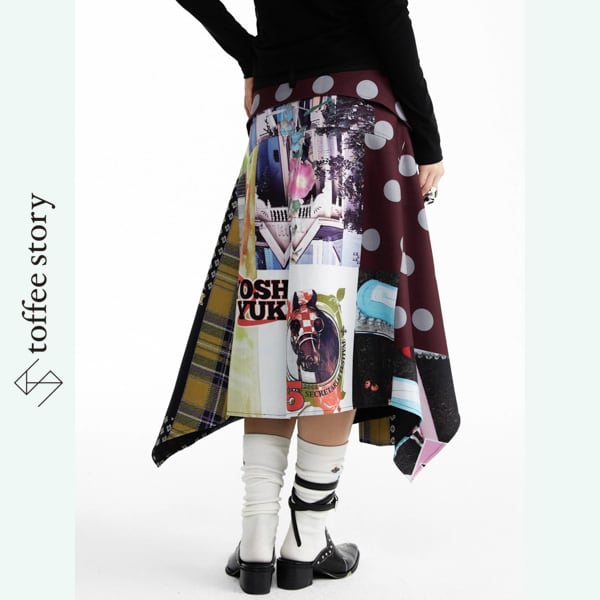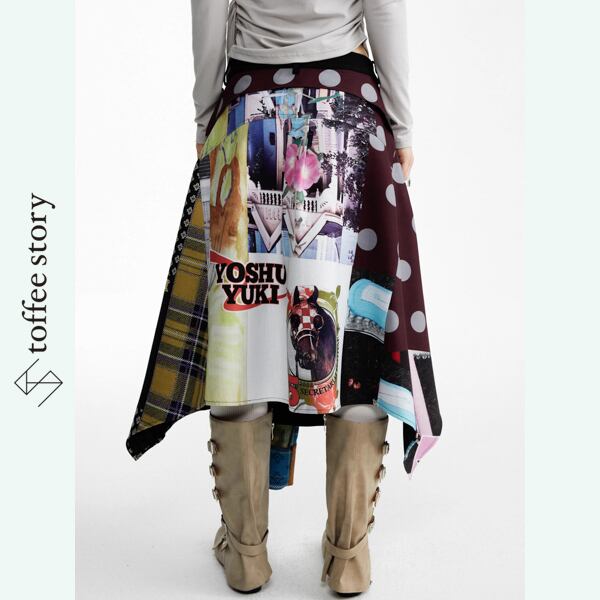 視線を奪う大胆なパッチワークプリントに、アシンメトリーな裾が軽やかに広がるデザインスカート