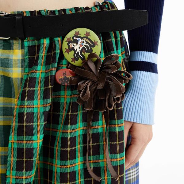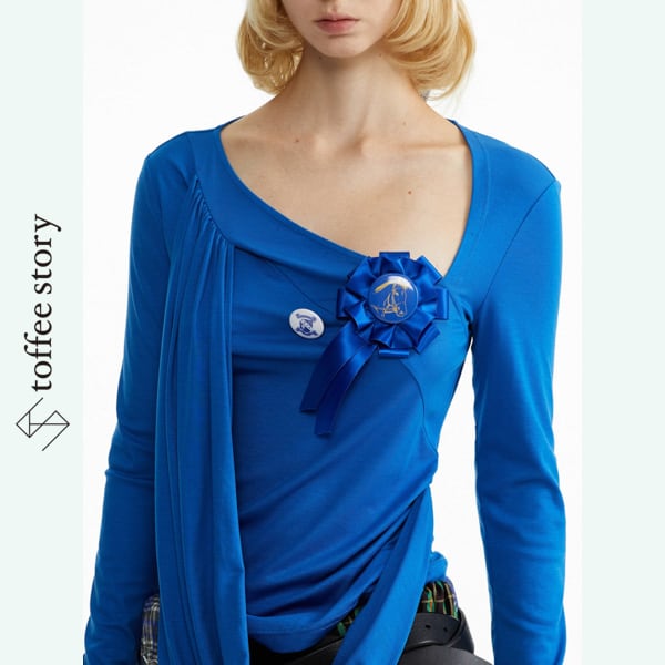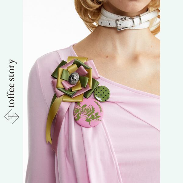 胸元に咲くリボンの花と、遊び心あふれるバッジのコンビネーション。クラシカルな装飾にアヴァンギャルドな響きを潜ませ、日常を小さなアートへと変えるアクセサリーです