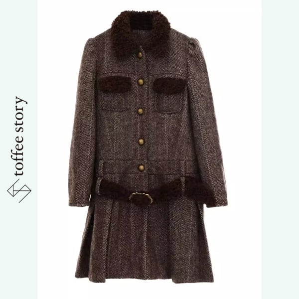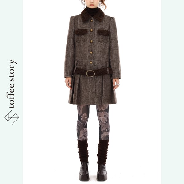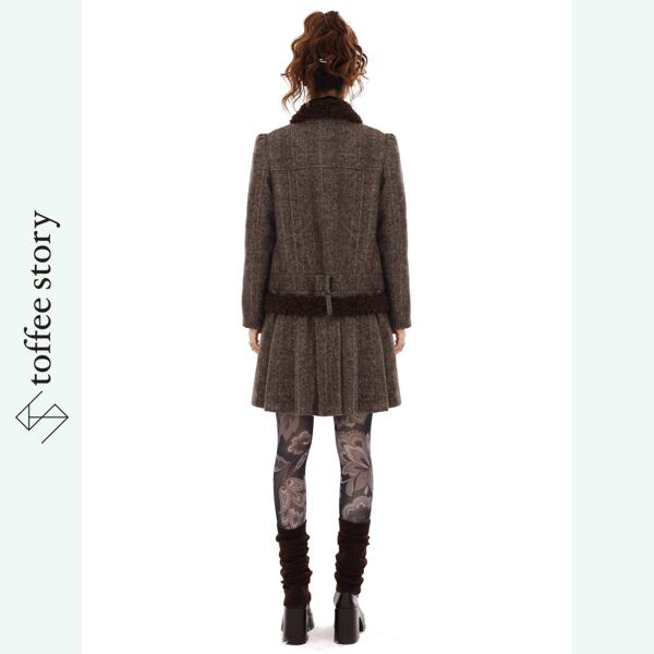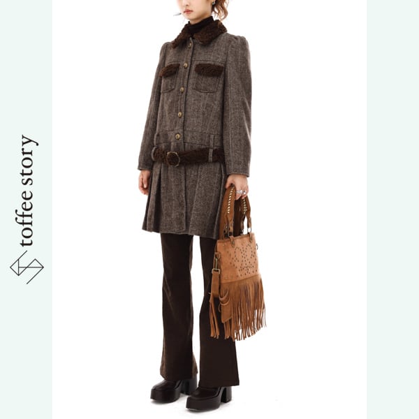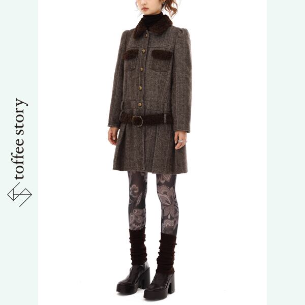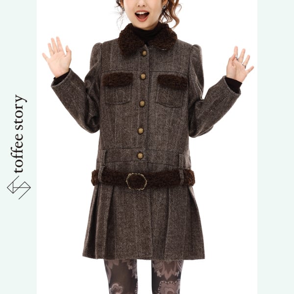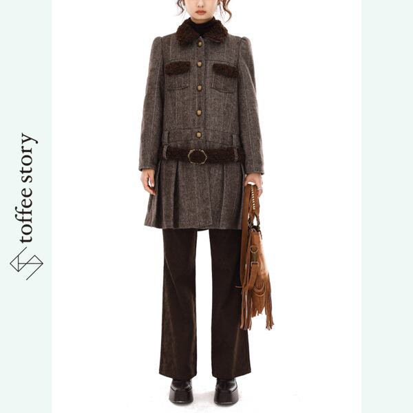 ヴィンテージライクなブラウンのヘリンボーンに、柔らかなファーの質感を添えたコート