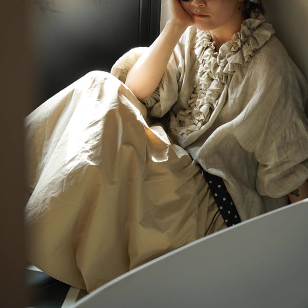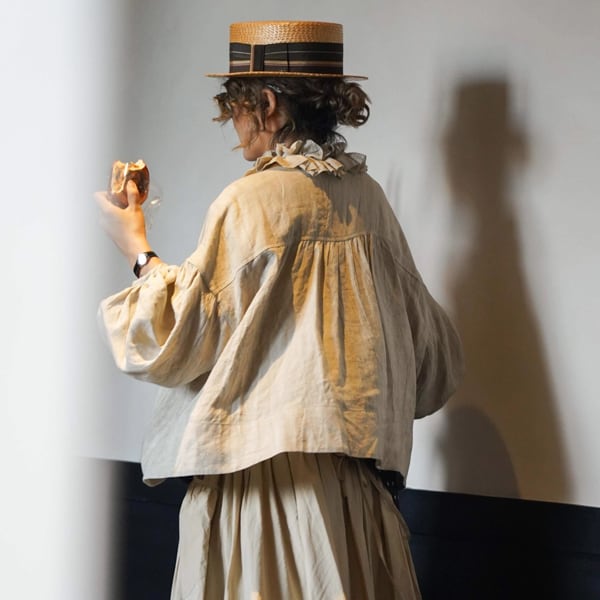 軽やかなリネン素材は季節を問わず心地よく、ロングスカートやワイドパンツと合わせれば、穏やかな物語を纏うような装いに。日常に詩情を添える一枚です。