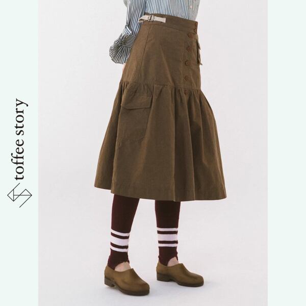 フロントに並ぶボタンと大きめのポケットが遊び心を漂わせ、ウエストからふんわり広がる切り替えデザインがレトロな陰影を描きます